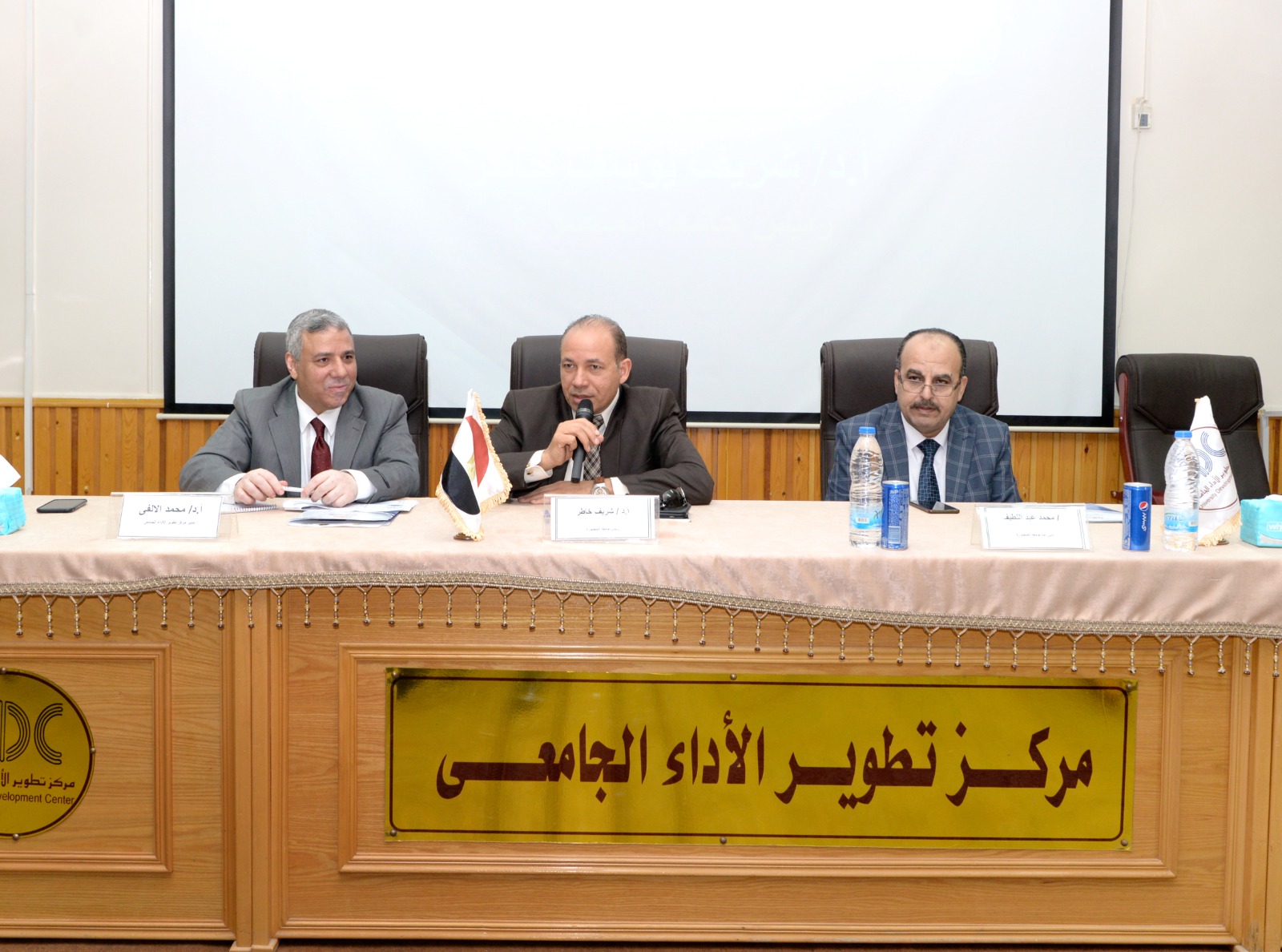 بحضور الدكتور شريف خاطر - رئيس الجامعة ومحمد عبد اللطيف أمين عام الجامعة والدكتور محمد الألفي مدير مركز تطوير الأداء الجامعي والدكتورة سماح السعيد نائب مدير المركز، والدكتوره نيفين عبد الخالق مدير وحدة التطوير الإداري والدكتورة أمل عبد الرازق مدير عام الشئون القانونية وعدد من أمناء الكليات ومديرى الإدارات وأعضاء الإدارات القانونية بالجامعة.