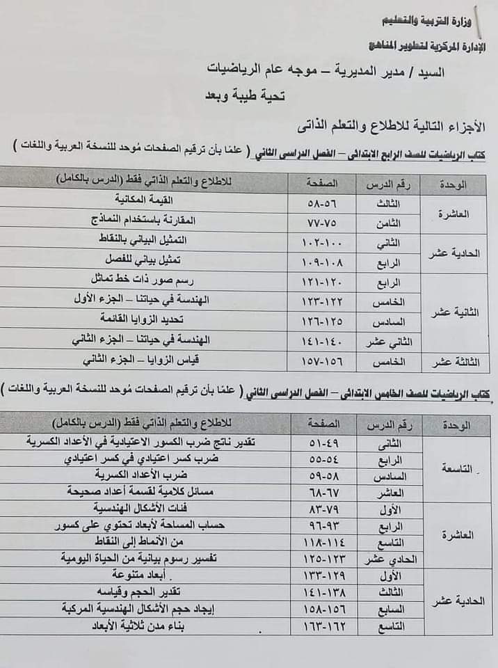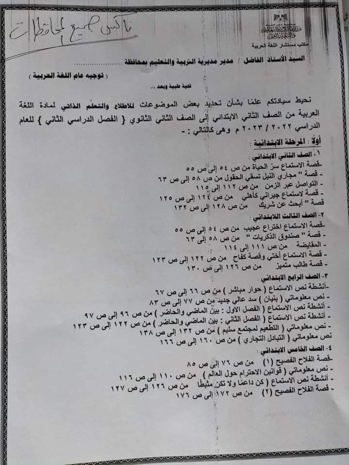 وجهت وزارة التربية والتعليم والتعليم الفني، خطابا هاما وعاجلا إلى جميع مديريات التربية والتعليم على مستوي الجمهورية بشأن تحديد بعض الموضوعات للاطلاع فقط والتعلم الذاتي من الصف الثاني الابتدائي وحتى الثاني الثانوي خلال الفصل الدراسي الثاني ٢٠٢٣.