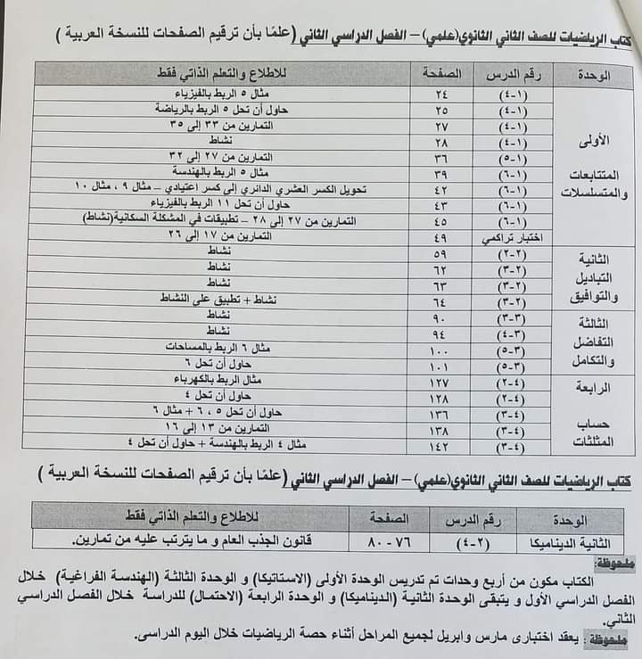 الالتزام بخطة توزيع المناهج الدراسية، ويُحظر عقد أي امتحانات خلال شهر أبريل ( عدا امتحان الشهر المخصص لطلاب صفوف النقل على أن تعقد امتحانات الفصل الدراسي الثاني لطلاب صفوف النقل والشهادة الإعدادية بدءًا من يوم السبت الموافق ٦ مايو)، وامتحانات طلاب الدبلومات الفنية بدءا من يوم السبت الموافق (۲۷ مايو)، وامتحانات طلاب شهادة إتمام الدراسة الثانوية العامة بدءا من يوم السبت الموافق ١٠ يونيو ٢٠٢٣.