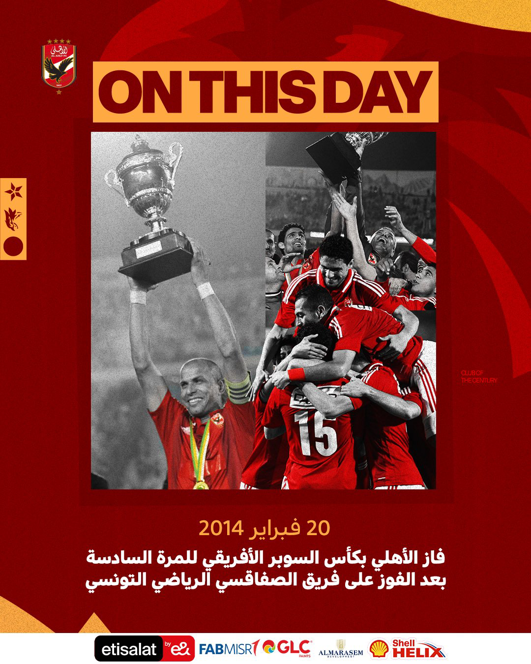 السوبر الأفريقي، حرص الحساب الرسمي للنادي الأهلي عبر موقع التواصل الاجتماعي فيس بوك على الاحتفال بذكرى حصول الفريق الأول لكرة القدم بالنادي على بطولة كأس السوبر الإفريقي للمرة السادسة في تاريخ القلعة الحمراء الذي كان في مثل هذا اليوم العشرين من فبراير من العام 2014 عندما تغلب على فريق الصفاقسي التونسي في المباراة النهائية بنتيجة 3-2.