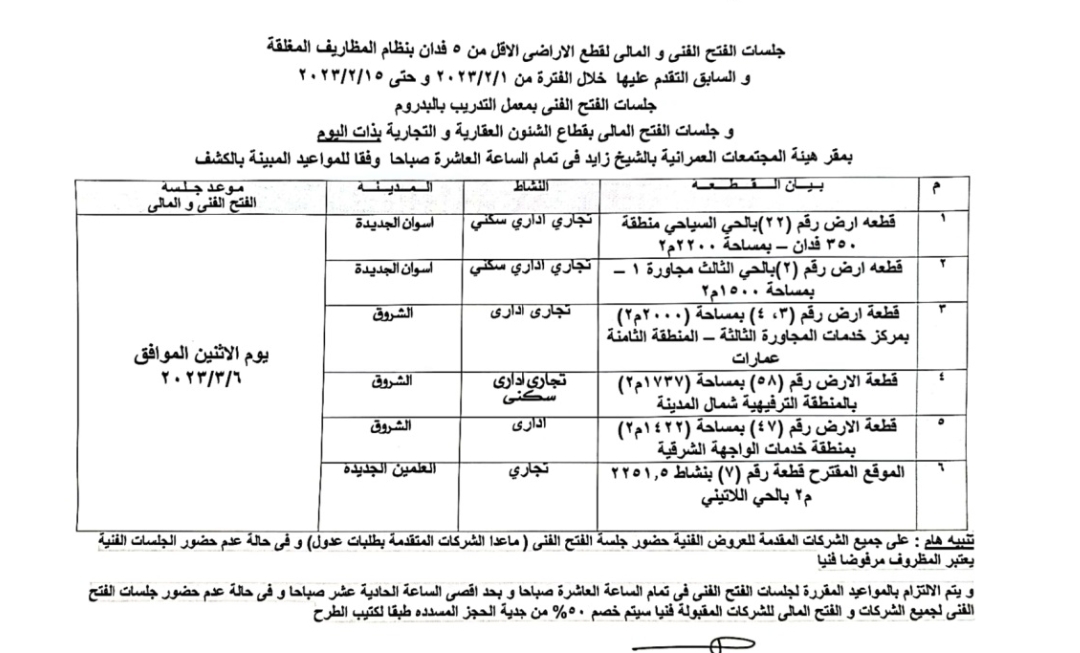 أراضي الإسكان، أعلنت وزارة الإسكان متمثلة في هيئة المجتمعات العمرانية الجديدة عن عقد جلسات الفتح الفني والمالي لقطع الأراضي الأقل من ٥ فدادين بنظام المظاريف المغلقة والتي قد سبق طرحها في الفترة من 1/2/2023 إلى 15/2/2023.