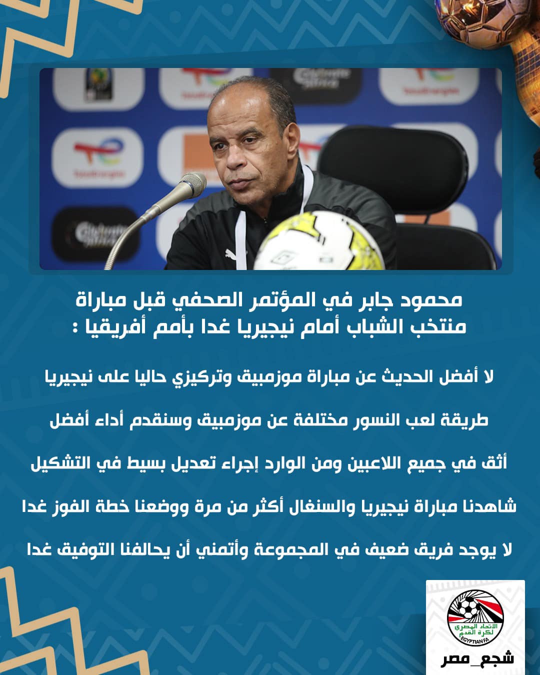 أمم افريقيا للشباب، أكد محمود جابر المدير الفني لمنتخب الشباب مواليد 2003 قبل مواجهة نيجيريا غدا الأربعاء ان طريقة لعب النسور مختلفة عن موزمبيق مشيرا إلى أنه يعد بتقديم أداء أفضل بمواجهة نيجيريا.