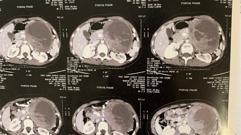 وتلقت العلاج بدون نتيجة وبدون تحسن ملحوظ وقد تم مناظرتها بالعيادة الخارجية بمركز الجهاز الهضمى وأوصى لها بعمل أشعة مقطعية ثلاثية الأبعاد متعددة المراحل ووجد أنها تعانى من ورم كبير بمنطقة البنكرياس..