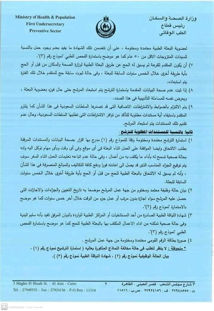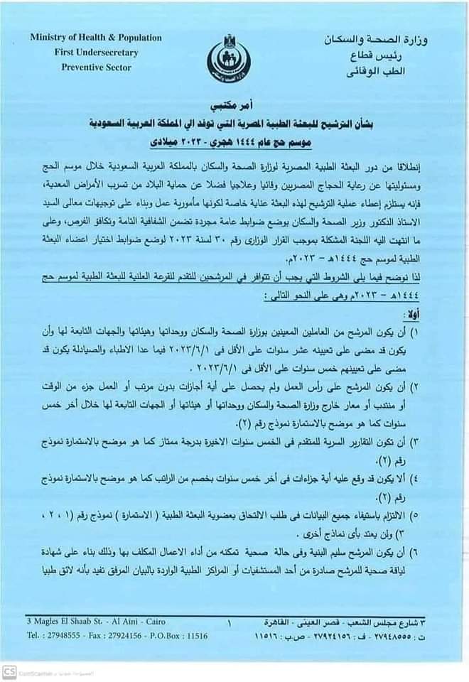 أعلنت وزارة الصحة والسكان عن بدء التقديم في البعثة الطبية المصرية للحج التي توفد الي المملكة العربية السعودية انطلاقا من دور البعثة الطبية المصرية لوزارة الصحة ومسئوليتها عن رعاية الحجاج المصريين وقائيا وعلاجيا فضلا عن حماية البلاد من تسرب الأمراض المعدية.