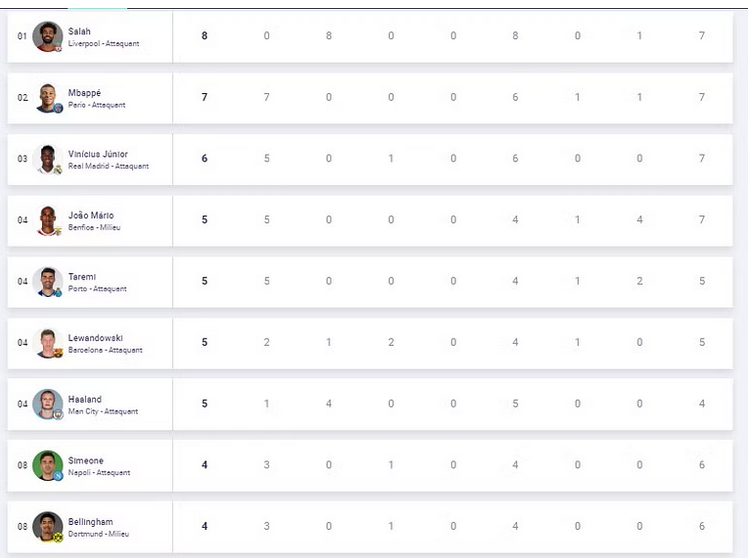 ورفع محمد صلاح رصيده إلى 8 أهداف متقدمًا على الفرنسي كيليان مبابي، الذي يملك 7 أهداف.