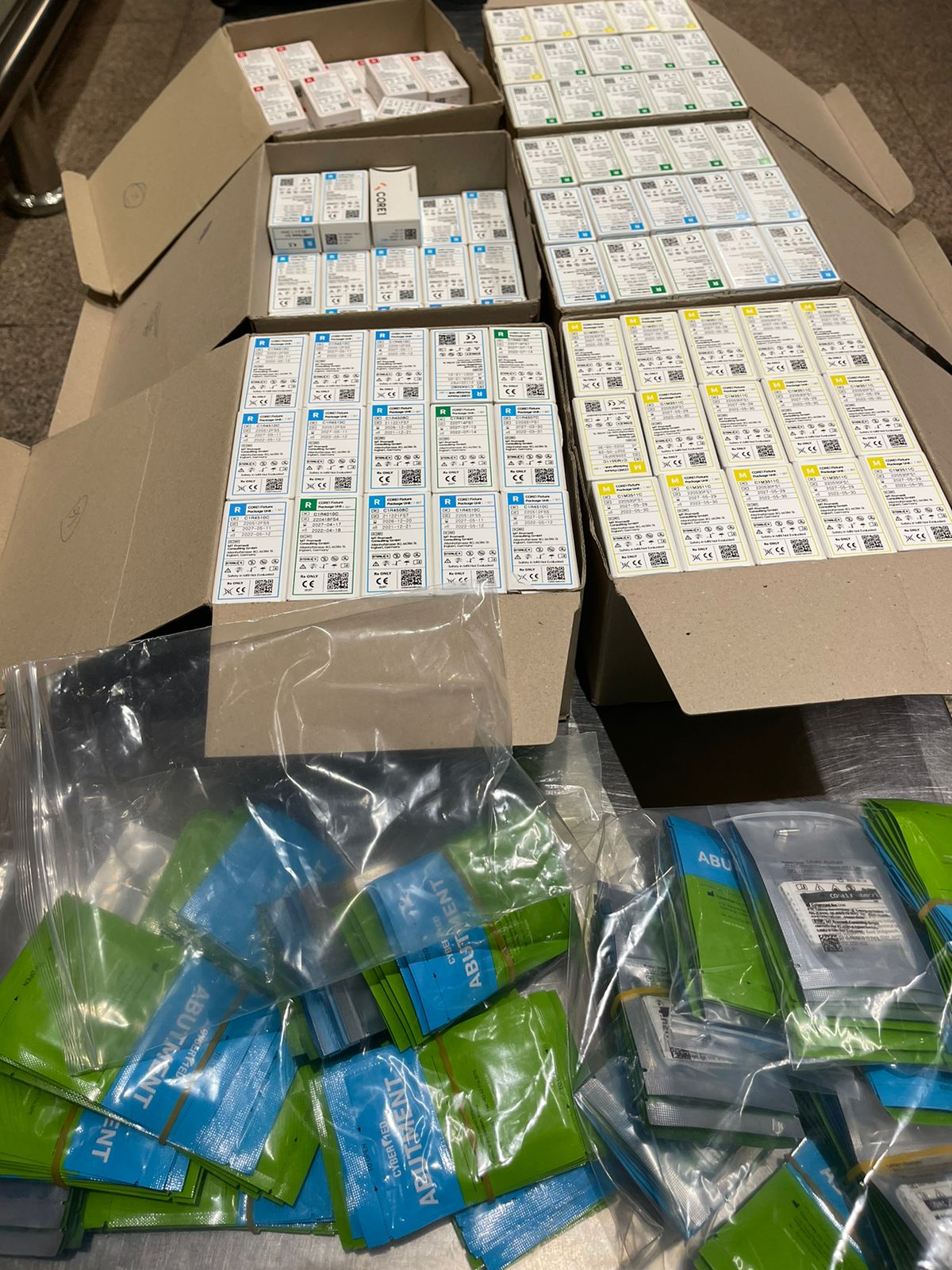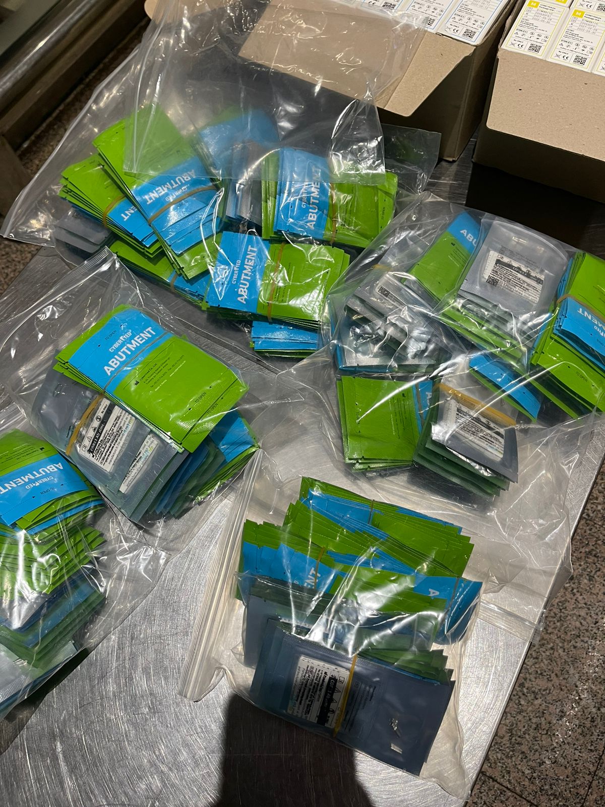 قامت لجنة مكونة من هاني محمود وعماد صلاح وأحمد عبد الواحد وحسام الشافعي وسامح سيد وكريم يوسف ومحمود عباس مآمير الجمرك وحازم محمد علي وجمال السيد مديري الحركة بعد وجرد وتوصيف وتحريز المضبوطات والتي بلغت ٧٤٤ علبة بداخلهم مسامير ومستلزمات لزراعة الأسنان.