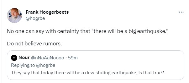 وجاء حديث فرانك هوجربتس، عن وقوع زلزال مدمر اليوم، ردًا على أحد متابعيه التي سألته قائلة: " يقولون أنه سيكون هناك زلزال مدمر اليوم، هل هذا صحيح؟"