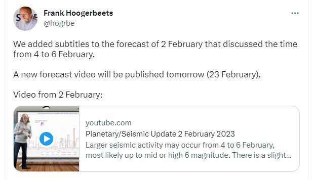 كما ذكر معهد أبحاث هندسة الأجرام السماوية ذات الصلة بالنشاط الزلزالي في هولندا SSGEOS، الذي يرأسه هوجربتس، في تغريدة سابقة "قد يحدث نشاط زلزالي أقوى (مجمعة) في الفترة من 20 إلى 22 فبراير تقريبًا، ومن المحتمل أن يبلغ ذروته في يوم 22". وعلّق بالقول: "نشرة الأمس في حال أنكم لم تروها".