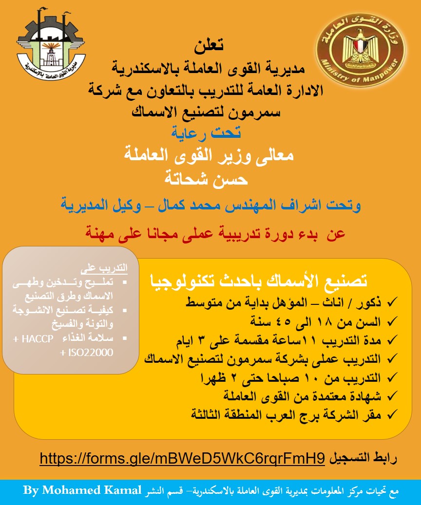 تعلن مديرية القوي العاملة بمحافظة الإسكندرية، عن برنامج تدريبى فى مجال تصنيع الأسماك وذلك تفعيلًا لبروتوكول التعاون فى مجال التدريب المهنى بين المديرية ومجموعة شركات سمرمون لتصنيع الأسماك.