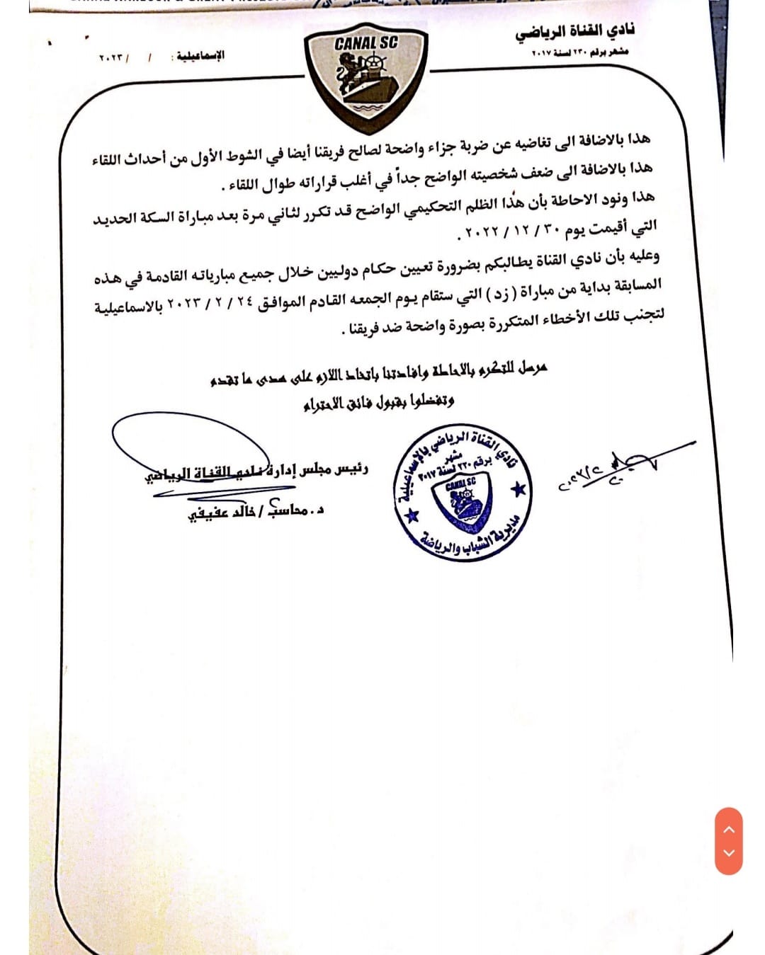 وطالب نادي القناة في بيانه، بضرورة تعيين حكام دوليين خلال جميع مبارياته القادمة في هذه المسابقة، بدايةً من مباراة (زد) القادمة الهامة، التي ستقام يوم الجمعة المقبل الموافق 24-2-2023 بالإسماعيلية، لتجنب تلك الأخطاء التحكيمية المتكررة.