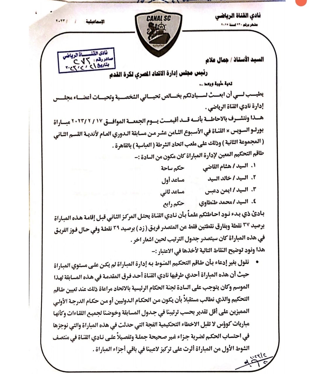 نادي القناة ، أرسل مجلس إدارة نادي القناة، برئاسة الدكتور خالد عفيفي، خطابًا للاتحاد المصري لكرة القدم، يدين خلاله الأخطاء التحكيمية التي شهدتها مباراة الفريق الأول لكرة القدم بنادي القناة أمام فريق بورتو السويس، خلال الجولة الثامنة عشرة من مسابقة دوري القسم الثاني والتي أقيمت علي ملعب اتحاد الشرطة بالعباسية الجمعة الماضي الموافق 17 من شهر فبراير الجاري.