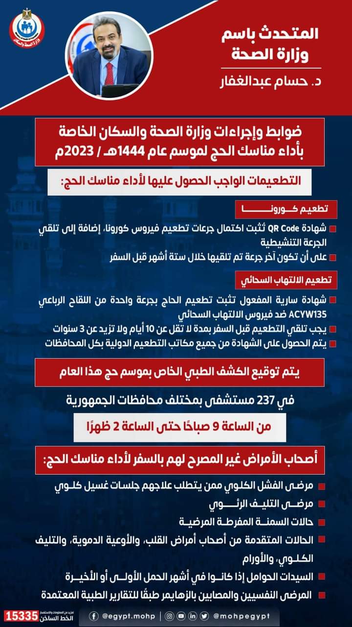 أعلن الدكتور حسام عبد الغفار المتحدث باسم وزارة الصحة عن ضوابط وإجراءات وزارة الصحة والسكان الخاصة بأداء مناسك الحج لموسم عام 1444 / 2023.