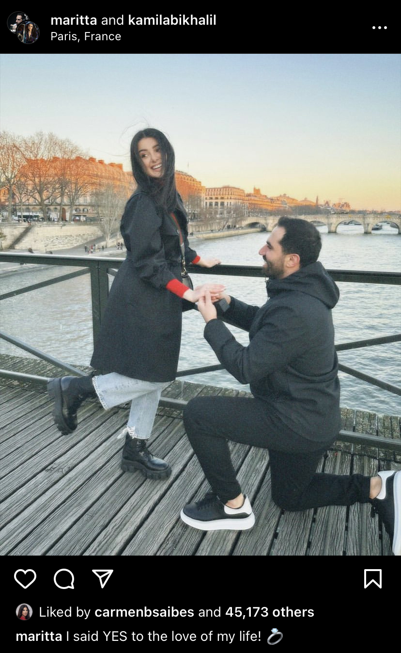 ونشرت ماريتا الحلاني صورة رومانسية تجمعها بخطيبها، وعلقت عليها قائلة: "قلت نعم لحب حياتي"، حيث انهالت العديد من التهنئات للثنائي بالخطوبة.