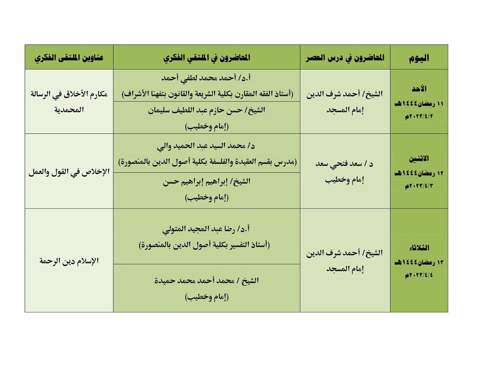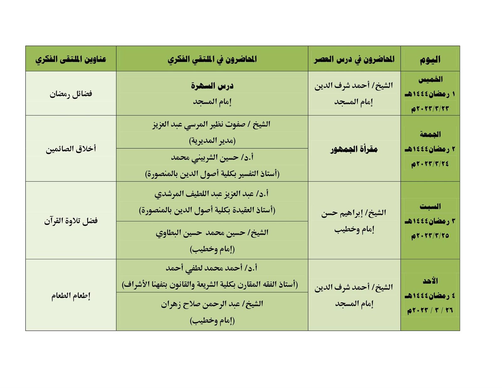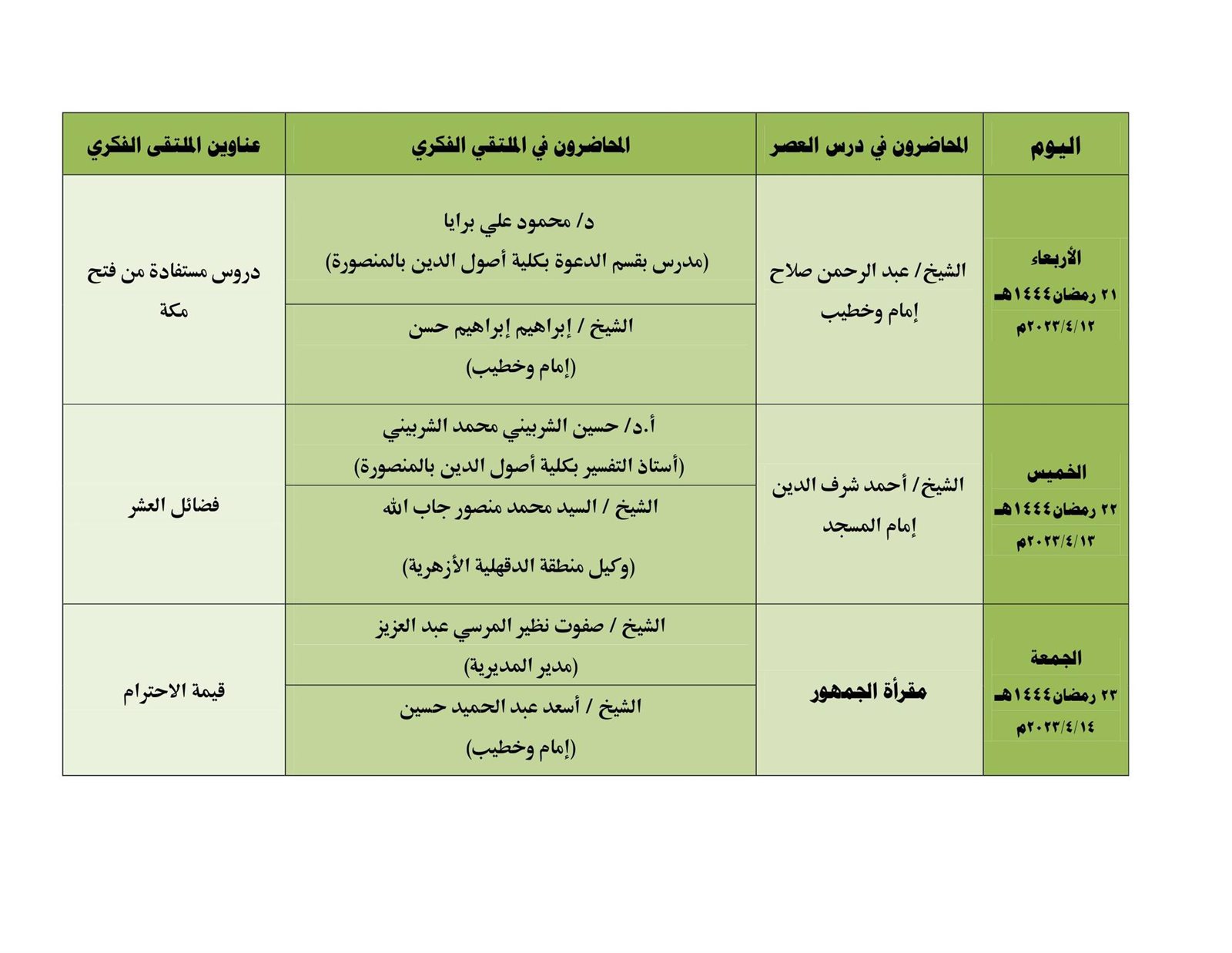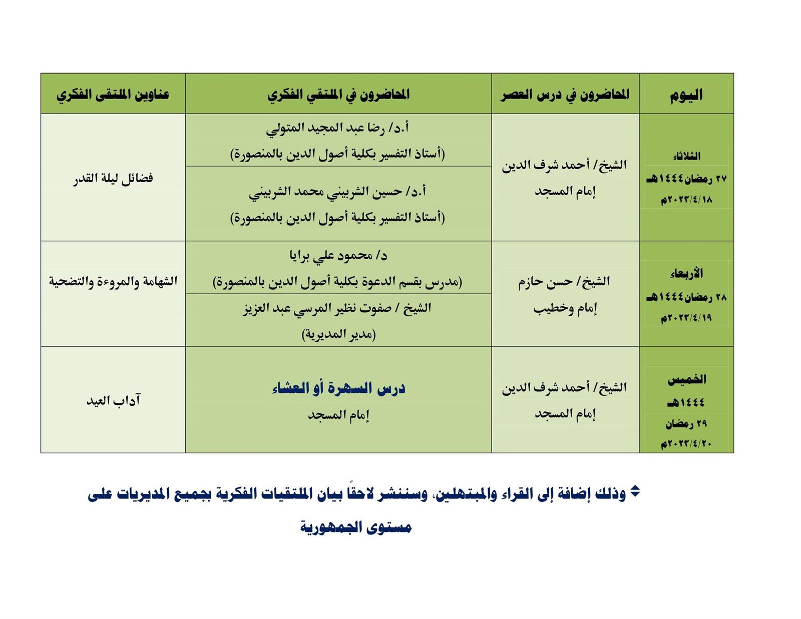 صرح الشيخ صفوت نظير المرسي - مدير مديرية الدقهلية بأن المديرية قد انتهت من الإعداد لملتقى الفكر الرمضاني عام 1444هــ - 2023م الذي يعقد يوميًّا عقب صلاة التراويح بمسجد: النصر – المنصورة - إدارة شرق المنصورة.