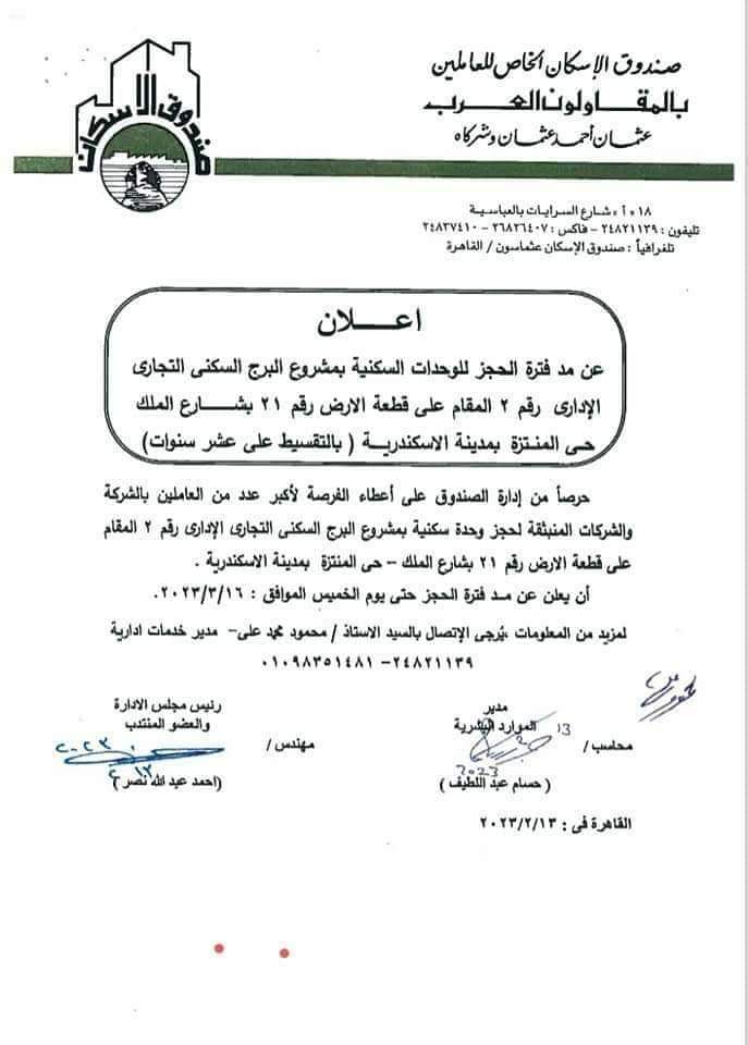 صندوق الإسكان، أعلن صندوق الإسكان الخاص بالعاملين بشركة المقاولون العرب عن مد فترة الحجز للوحدات السكنية بمشروع البرج السكنى التجارى الإدارى رقم 2 المقام على قطعة الارض رقم 21 بشارع الملك حى المنتزة بمدينة الإسكندرية وذلك بنظام التقسيط على 10 سنوات.