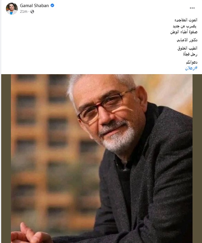 وكتب الدكتور جمال شعبان عن سر وفاة الدكتور الإمبابي وموت الفجأة، عبر الفيس بوك، فقال: "الموت المفاجىء يضرب من جديد صفوة أطباء الوطن دكتور الإمبابي الطيب الخلوق رحل فجأة دعواتكم"