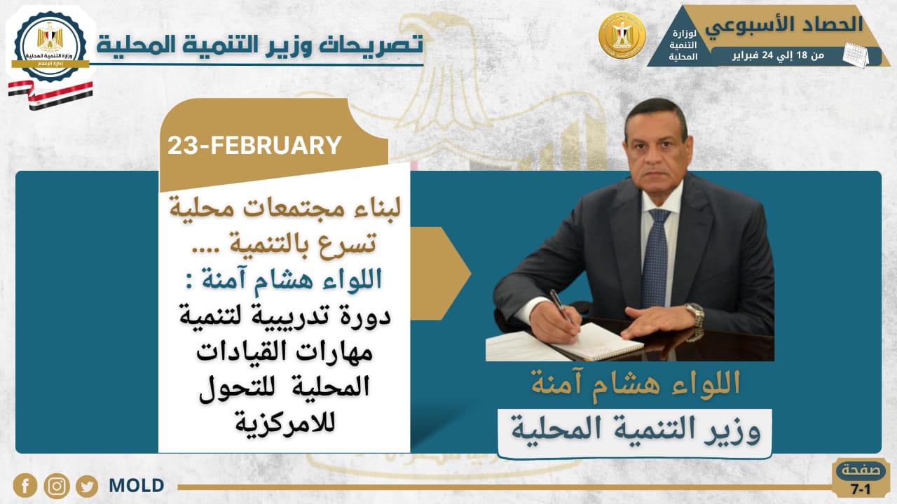 وأكد اللواء هشام آمنة وزير التنمية المحلية، أن الوزارة لها رؤية وخطة هادفة لبناء مجتمعات محلية تقود وتسرع بالتنمية في كل محافظة، وتحقق آمال وطموحات المصريين في إطار دولة قوية وإدارة عصرية والحكم الرشيد، مشيرًا الى أن مركز التنمية المحلية بسقارة يشهد الاسبوع المقبل وهو الاسبوع الـ29 تنظيم دورة تنمية مهارات القيادات في مجال التحول إلى اللامركزية، ويستفيد منها 28 متدرب من رؤساء الوحدات القروية وسكرتيري مجالس المدن والاحياء ويقوم بتنفيذها وحدة الادارة المحلية بالوزارة والاتحاد الاوروبي، مما يعزز من تحقيق أهداف اللامركزية ورشد القرار والمشاركة والديمقراطية والشفافية اللازمة لتنمية مستدامة وحياة أفضل، موضحًا أن الأسبوع الـ29 بمركز سقارة سيتضمن أيضًا عقد دورة تدريبية عن التخطيط البرامجى وبرامج التنمية المحلية المطورة ويستفيد منها 25 متدربا من مديرى ومسئولى التخطيط بالوزارة والمحافظات، ودورة إدارة الأزمات والحد من المخاطر والتى يستفيد منها 28 متدرب من العاملين بإدارات الأزمات بالمحافظات، بالإضافة إلى دورة تحليل البيانات باستخدام برنامج SPSS، فيما تستمر للأسبوع الثانى على التوالى دورة استخدام نظم المعلومات الجغرافية GIS ويستفيد منها 38 متدرب في جميع المحافظات.