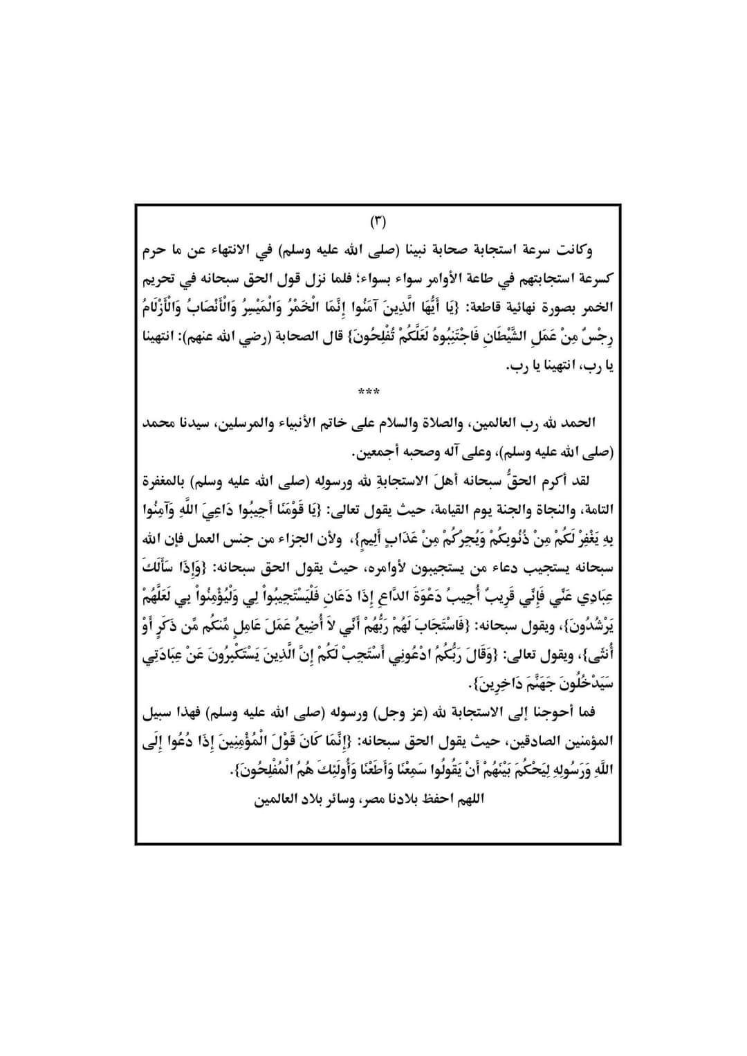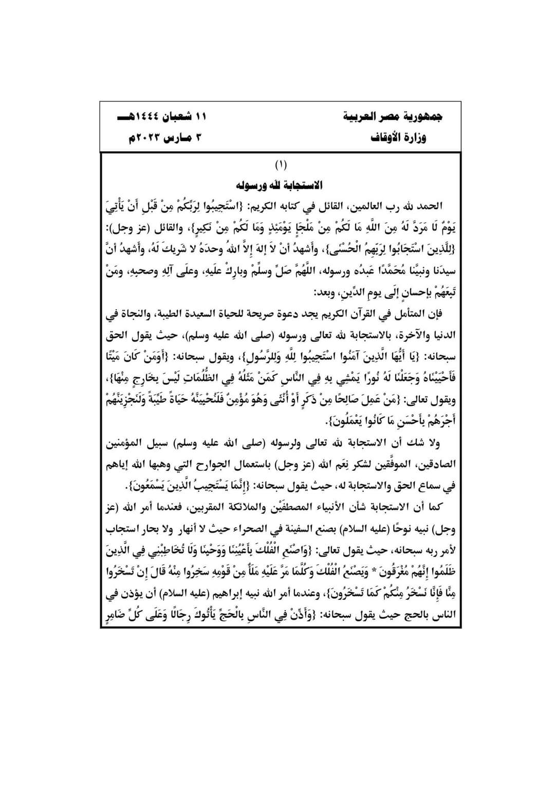 يؤدي ائمة وخطباء وزارة الأوقاف موضوع خطبة الجمعة القادمة 3 مارس 2023م تحت عنوان: "الاستجابة لله ورسوله".