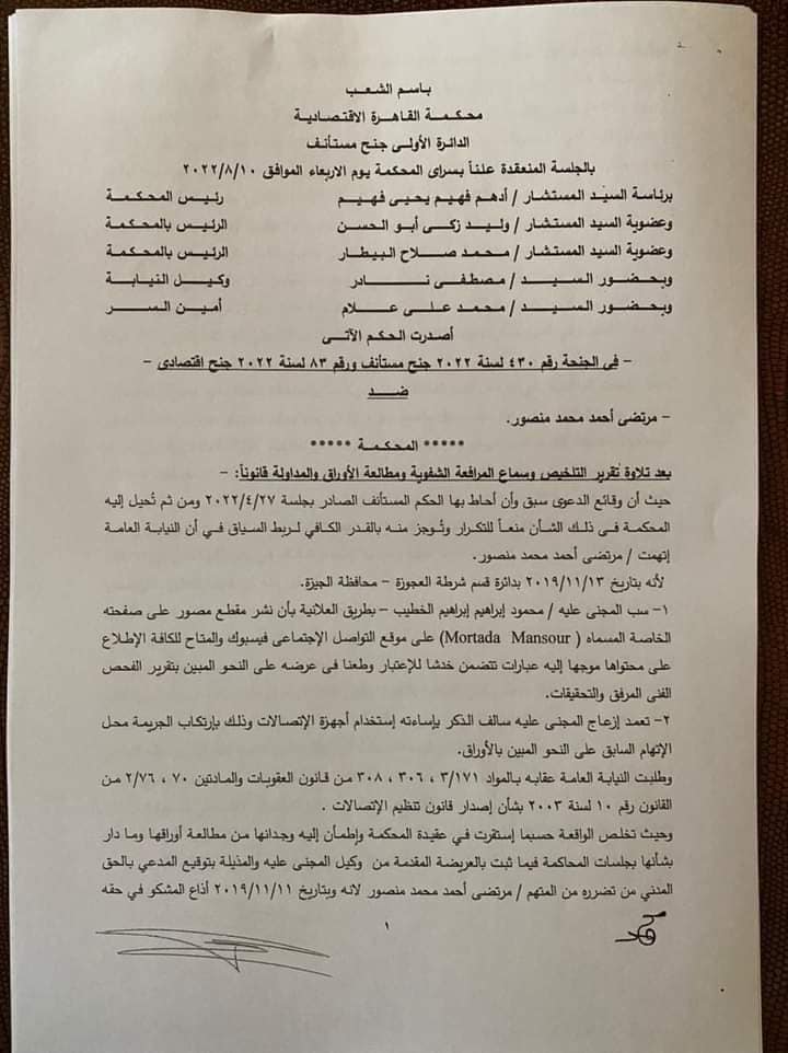 ويعني الحكم أن المحكمة قضت بسجن مرتضى منصور سنتين وغرامة 20 ألف جنيه في كلتا الدعويين.
