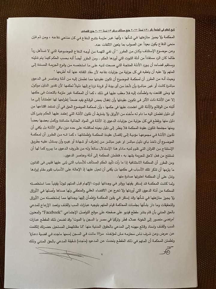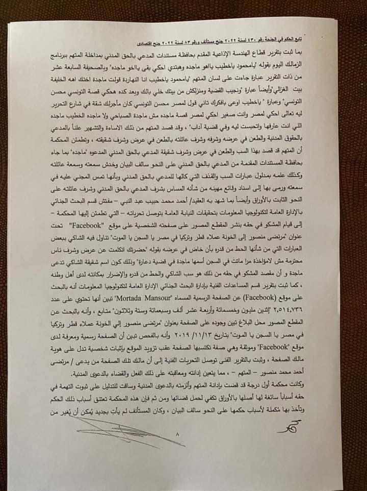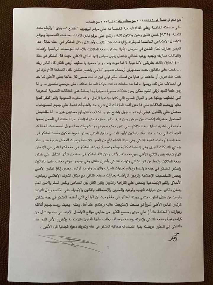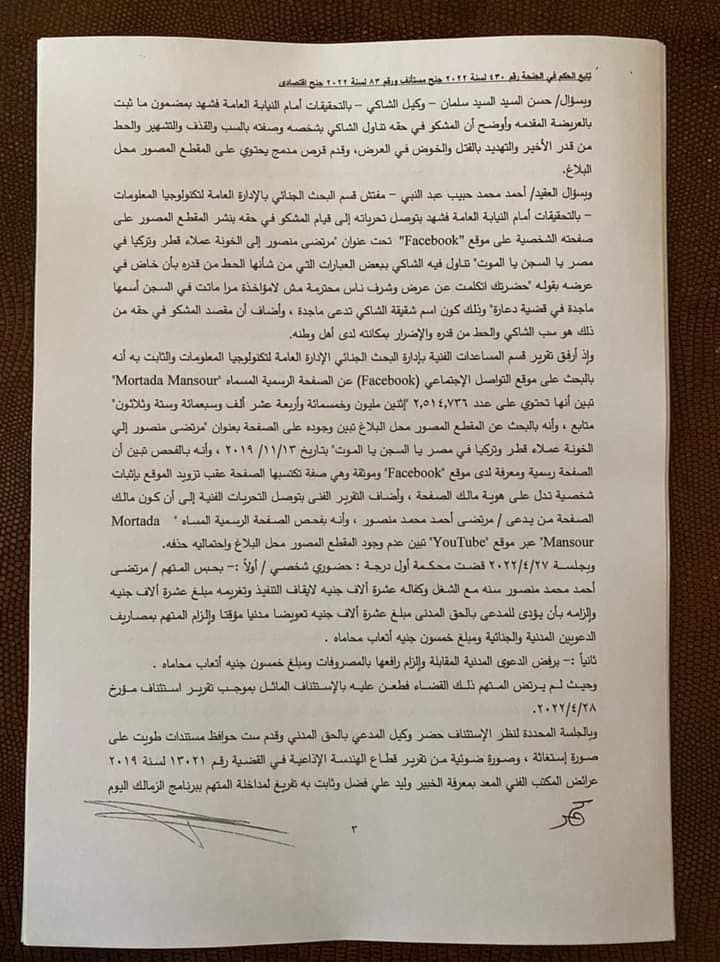 وقالت المحكمة في حيثيات حكمها، إن الواقعة حسبما استقر في عقيدتها واطمأن إليه وجدانها من مطالعة أوراقها وما دار بشأنها بجلسات المحاكمة فيما ثبت بالعريضة المقدمة من وكيل المجني عليه والمذيلة بتوقيع المدعي بالحق المدني من تضرره من المتهم مرتضى أحمد محمد منصور لأنه بتاريخ 11 نوفمبر 2019، أذاع المشكو في حقه على صفحته الخاصة وعلى القناة الرسمية الخاصة به على موقع اليوتيوب "مقطع تصويري" والبالغ مدته الزمنية خمس دقائق واثنين وثلاثين ثانية، ونشره على موقع نادي الزمالك وصفحته الشخصية ومواقع التواصل الاجتماعي الخاضعة لسيطرته وإدارته تضمنت أكاذيب وأضاليل وكال المشكو في حقه خلال هذا الفيديو عبارات تمثل الطعن في أعراض الأفراد وخدش سمعة العائلات والإساءة للمؤسسات الرياضية وإهانات وانتهاكات مسارحه وتهديد ووعيد للشاكي باعتباره رئيس مجلس إدارة النادي الأهلي.