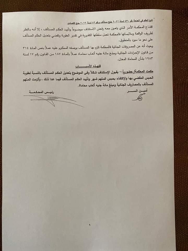 وذكرت محكمة مستأنف الاقتصادية أن محكمة أول درجة قضت بإدانة المتهم وألزمته بالدعوى المدنية، وقدمت أدلة على ثبوت التهمة في حقه بالأوراق، ومن ثم فإن المحكمة تعتنق أسباب ذلك الحكم وتأخذ بها مكملة لأسباب حكمها على النحو سالف البيان، وكان المستأنف لم يأت بجديد يمكن أن يغير من اقتناع المحكمة الأمر الذي يتعين معه رفض الاستئناف موضوعًا وتأييد الحكم المستأنف، إلا أنه بالنظر لظروف الواقعة وملابساتها فالمحكمة تعمل سلطتها التقديرية في تقدير العقوبة وتقضي بتعديل الحكم المستأنف على نحو ما يرد بالمنطوق.