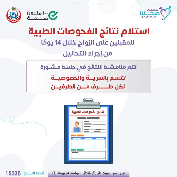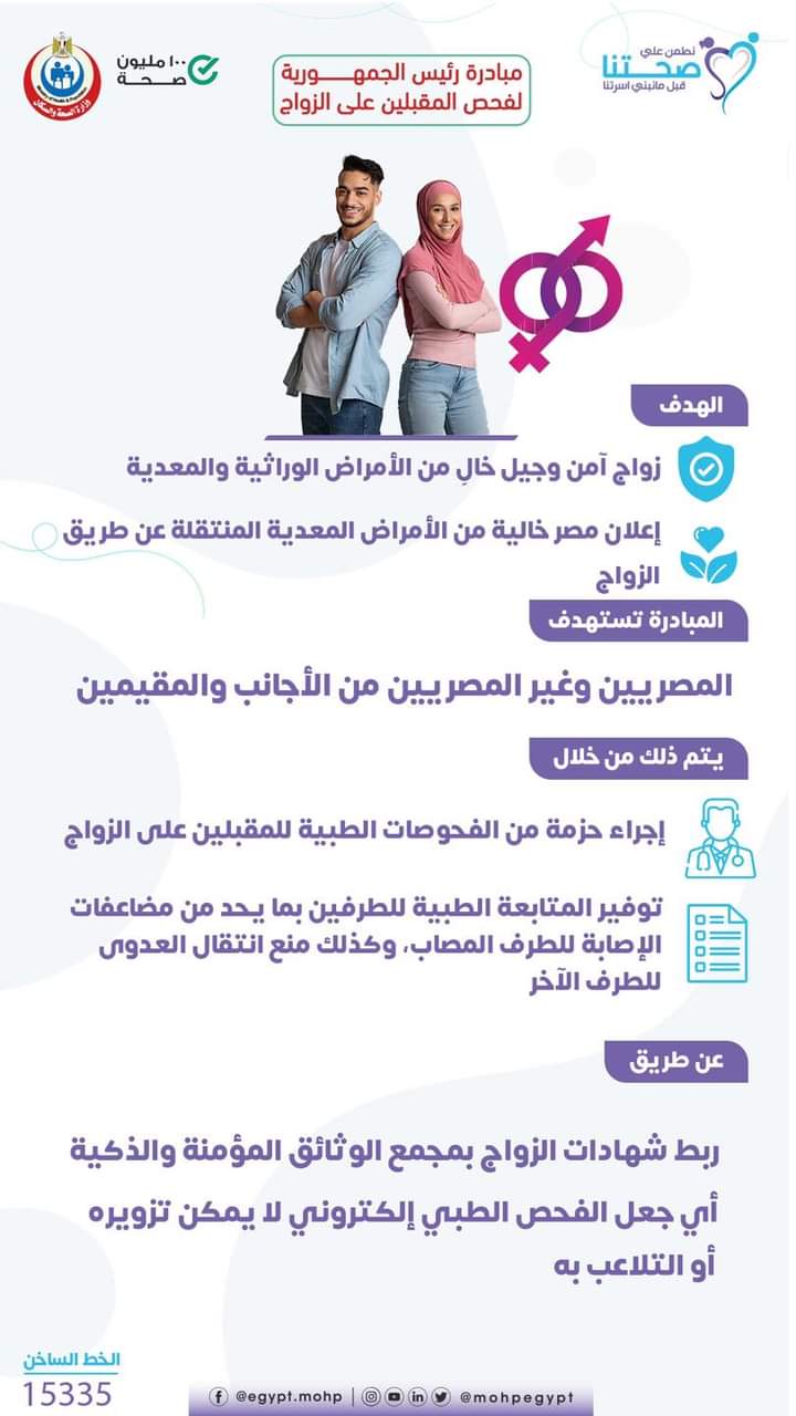 وأعلنت وزارة الصحة والسكان بدء تقديم خدمات الفحص الطبي للمقبلين على الزواج للمصريين وغير المصريين المقيمين في مصر في جميع الوحدات الصحية.