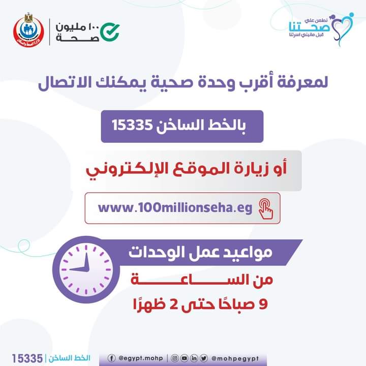 وأوضحت وزارة الصحة أنه لمعرفة أقرب وحدة صحية لعمل الفحوصات بالاتصال على الخط الساخن ١٥٣٣٥.
