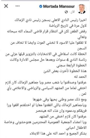 وعلق مرتضى منصور على تأييد حبسه في سب وقذف الكابتن محمود الخطيب رئيس النادي الأهلي عبر منشور على صفحته على موقع التواصل الاجتماعي فيس بوك.