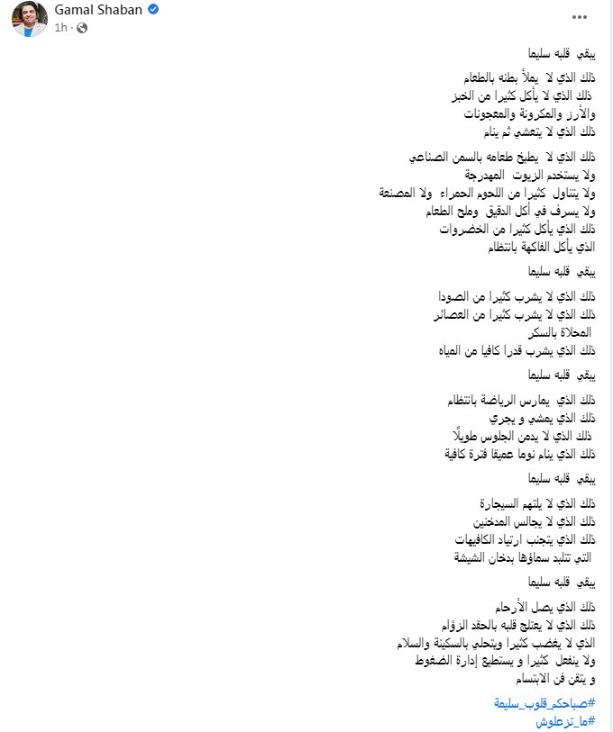 وأضاف جمال شعبان: "يبقى قلبه سليما الذي لا يلتهم السيجارة، والذي لا يجالس المدخنين، ويتجنب ارتياد الكافيهات التي تتلبد سماؤها بدخان الشيشة"