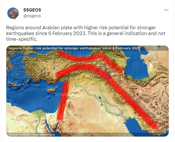 وعن مناطق الزلزال الخطرة، كشف معهد العالم الهولندي فرانك هوجربتس الخاص بالنشاط الزلزالي "SSGEOS" خريطة عبر تويتر مؤكد فيها أن "المناطق المحيطة بالصفيحة العربية ذات احتمالية أعلى لخطر الزلازل القوية منذ 6 فبراير 2023. هذا مؤشر عام وليس محددًا زمنيًا."