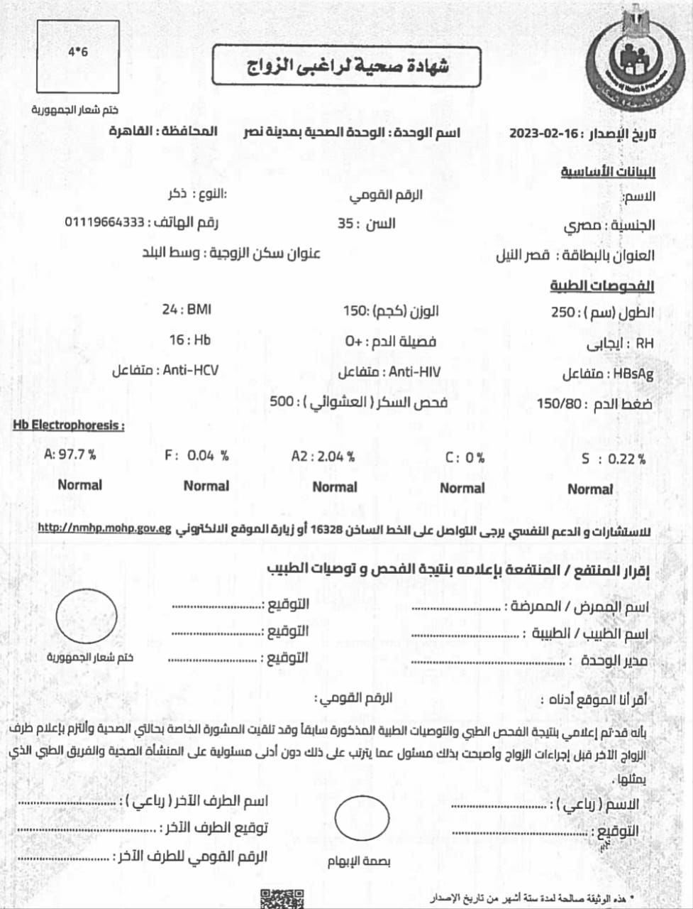 وحصلت " فيتو" على نسخة من شهادة فحص المقبلين على الزواج وتضمنت إقرار الطبيب والممرض ومدير الوحدة الصحية بإبلاغ المقبلين على الزواج بنتيجة الفحص الطبي.