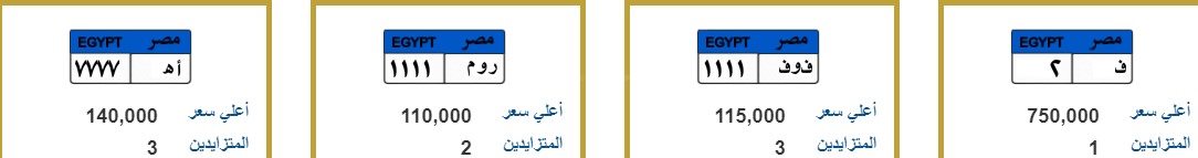 كما طرحت لوحات مميزة أخرى " س ي د 7 " بسعر 425 الف جنيه، " م ج 9 " بسعر 400 الف جنيه، " أ ل أ 1 " بقيمة 425 الف جنيه، " ف 2 " بسعر 750 الف جنيه.