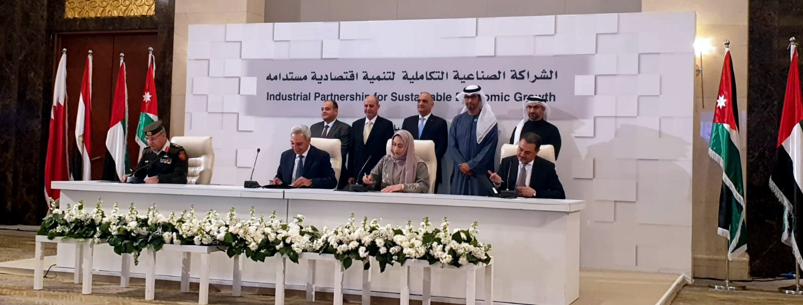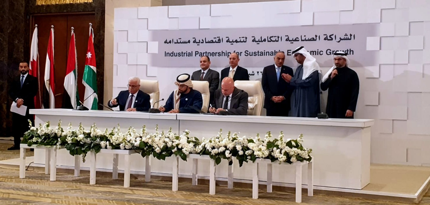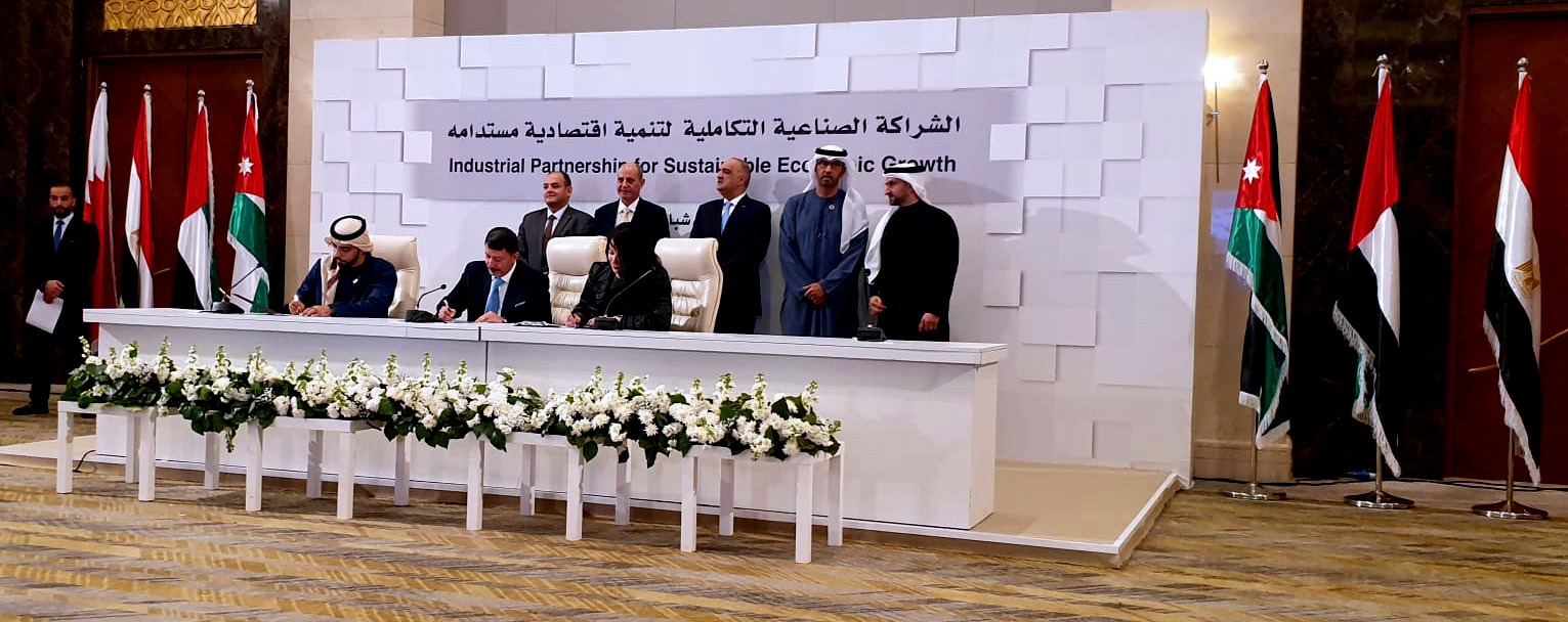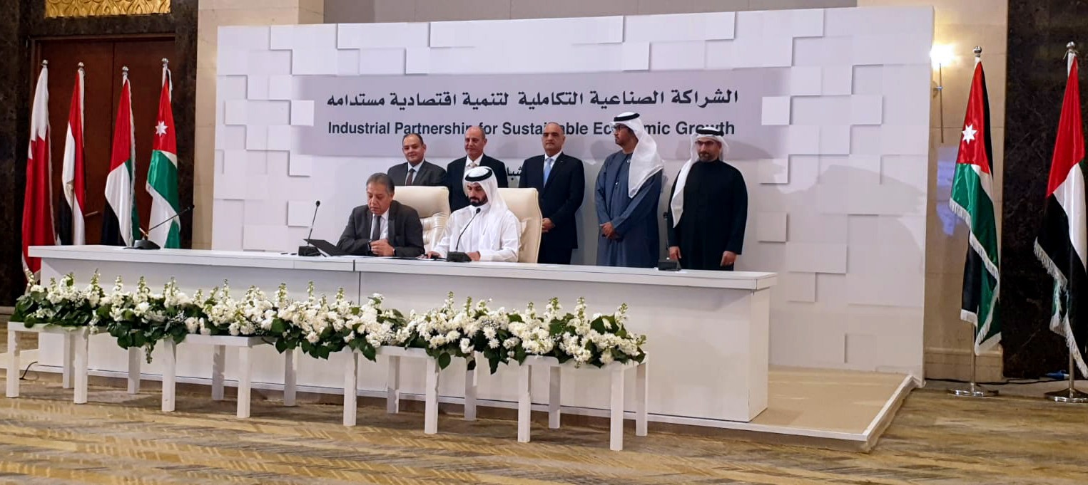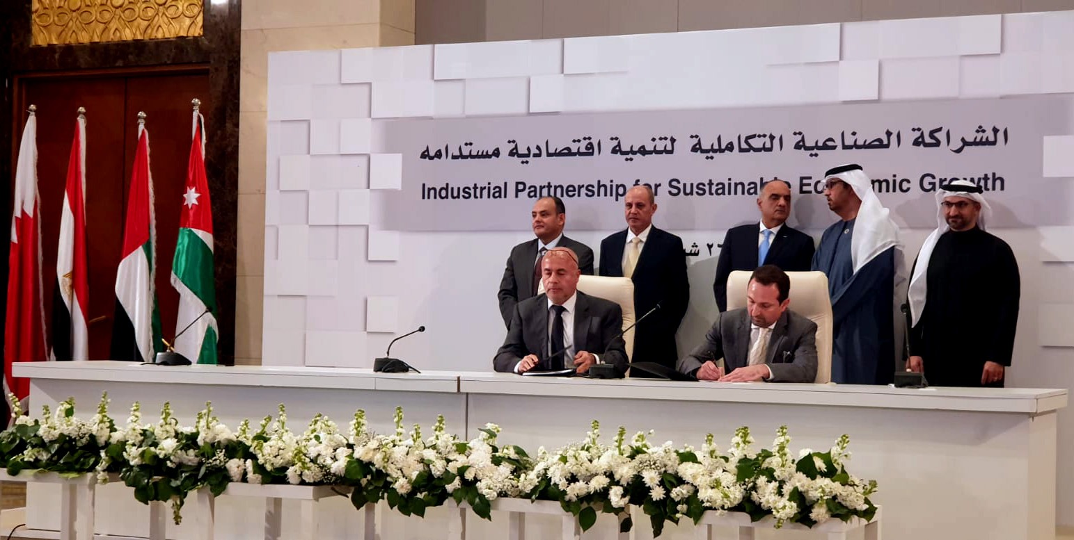 شهد الدكتور بشر الخصاونة رئيس الوزراء بالمملكة الأردنية الهاشمية، وكل من المهندس أحمد سمير وزير التجارة والصناعة بجمهورية مصر العربية، والدكتور سلطان بن أحمد الجابر وزير الصناعة والتكنولوجيا المتقدمة المبعوث الخاص لدولة الإمارات للتغير المناخي، ويوسف الشمالي وزير الصناعة والتجارة والتموين والعمل في المملكة الأردنية الهاشمية، عبدالله بن عادل فخرو، وزير الصناعة والتجارة في مملكة البحرين، مراسم التوقيع على 12 اتفاقية وشراكة في 9 مشاريع صناعية تكاملية بقيمة استثمارية تتجاوز 2 مليار دولار في قطاعات الزراعة والأدوية والمعادن والكيماويات والسيارات الكهربائية، وذلك فى ختام فعاليات الاجتماع الثالث لـ "اللجنة العليا للشراكة الصناعية التكاملية لتنمية اقتصادية مستدامة"، والتي استضافتها العاصمة الأردنية عمان على مدى يومين.