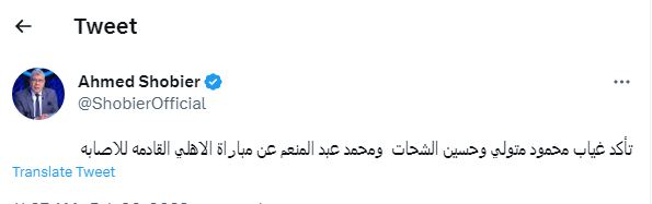 وكتب شوبير عبر حسابه على موقع التواصل الاجتماعي “تويتر”.: “ تأكد غياب محمود متولي وحسين الشحات ومحمد عبد المنعم عن مباراة الأهلي القادمه للإصابة”.