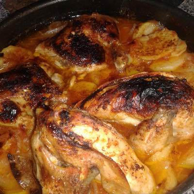 - بعدها نرص الدجاج المتبلة على الوجه، ونغطى الصينية بالفويل وندخلها الفرن الساخن حتى تمام النضج.