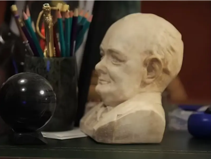 وأظهرت الصور مكتب زيلينسكي يحث توجد نماذج للطائرات وصورة له ولزوجته أولينا مع طفليهما، بالإضافة إلى تمثال للزعيم البريطاني ونستون تشرشل.