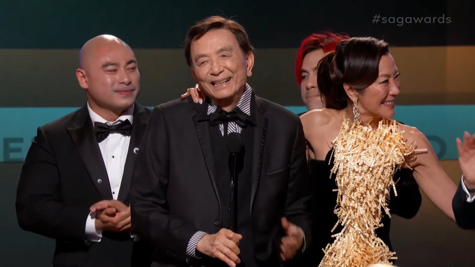 SAG Awards، استغل الطاقم التمثيلي لفيلم، Everything Everywhere All at Once، فوزهم بجائزة أفضل طاقم تمثيلي في إنتاج سينمائي خلال حفل توزيع الجوائز العالمي، ليكرموا زميلهم الممثل القدير "جيمس هونغ"، والبالغ من العمر 94 عامًا.