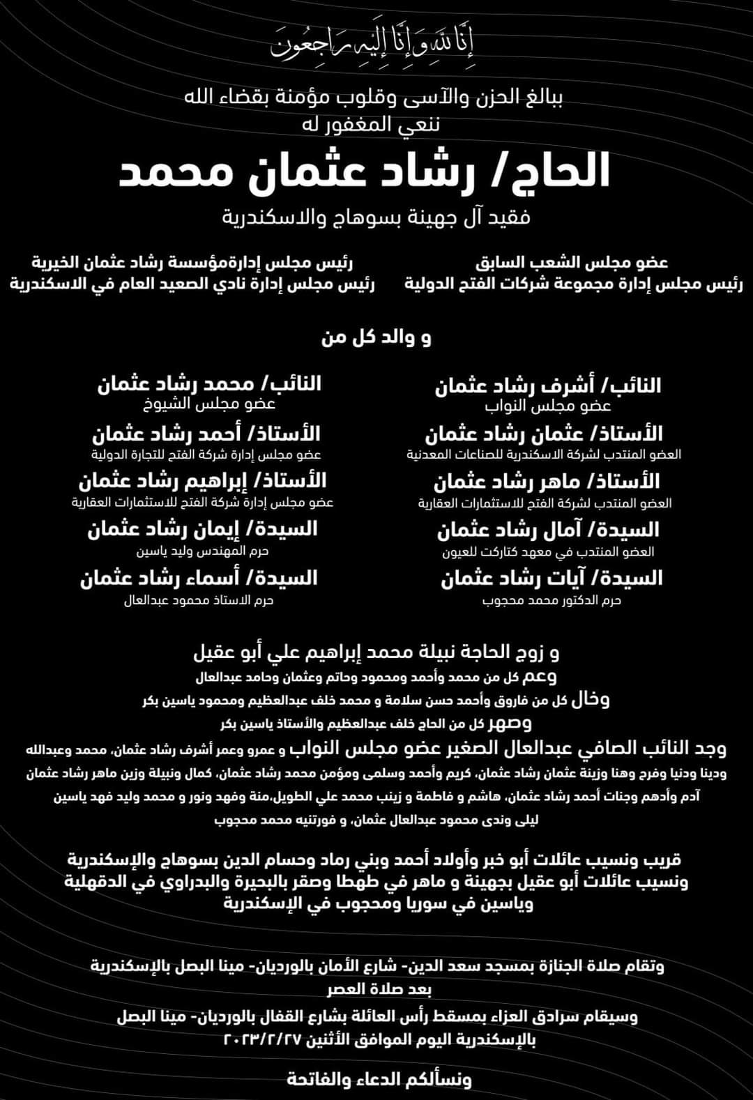 تشيع عصر اليوم من مسجد سعد الدين بمنطقة مينا البصل، جنازة السياسي البارز الحاج رشاد عثمان عضو مجلس الشعب الأسبق، رئيس نادي الصعيد العام بالإسكندرية، ووالد النائبين محمد رشاد عثمان عضو مجلس النواب، وأشرف رشاد عثمان عضو مجلس النواب ونائب رئيس حزب مستقبل وطن، وجد النائب الصافي عبد العال.