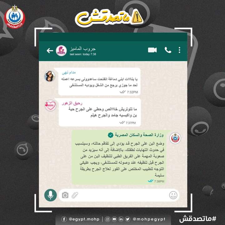 وحذرت وزارة الصحة من وضع البن على الجرح لأنه يؤدي إلى تفاقم الحالة ويتسبب في حدوث التهابات للطفل ويزيد من صعوبة المهمة على الفريق الطبي لتنظيف البن من على الجرح عند وصوله للمستشفى.