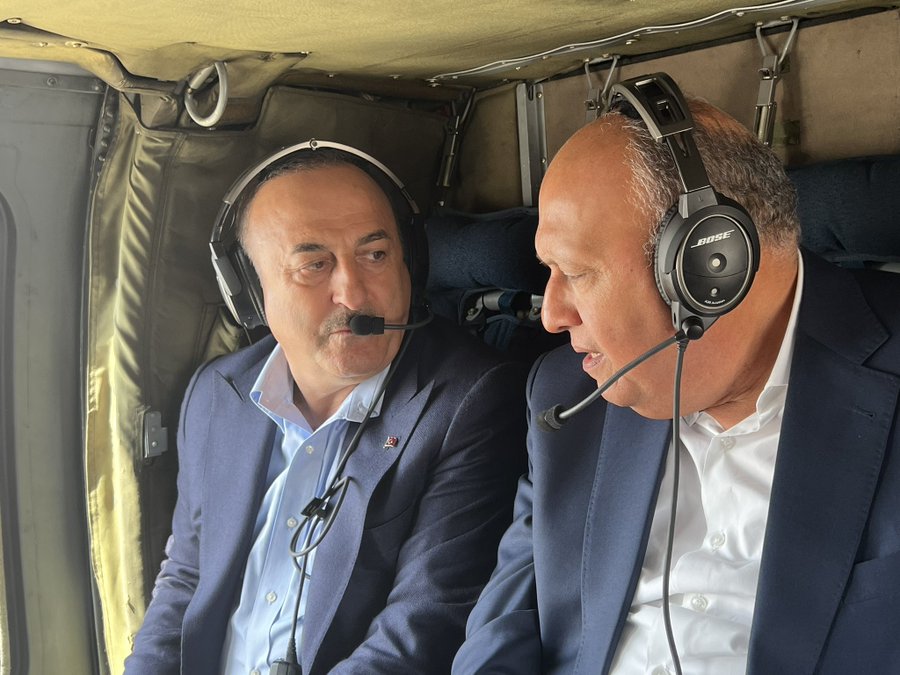 وأظهرت إحدى الصور التي نشرها المتحدث باسم وزارة الخارجية، السفير أحمد أبوزيد، على تويتر، الوزير سامح شكري ونظيره التركي على متن طائرة العمودية متوجهين إلى ميناء مرسين لتسلم الشحنة رقم ٦ من المساعدات الإغاثية المصرية المقدمة إلى تركيا.