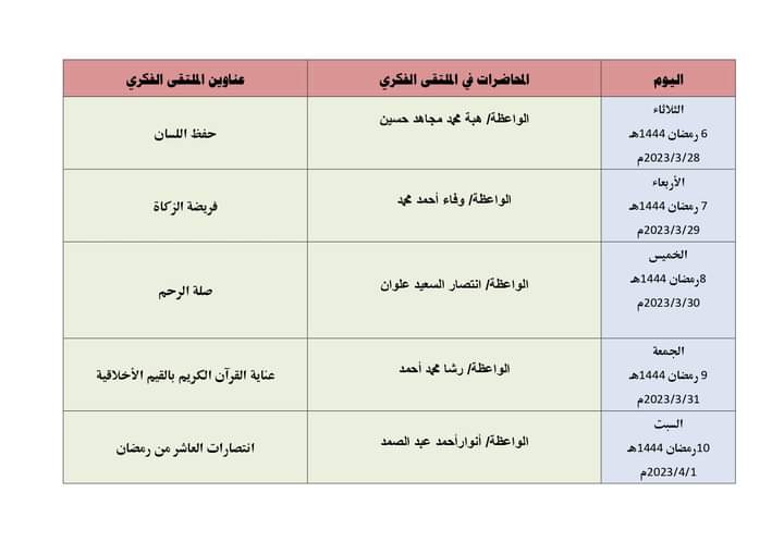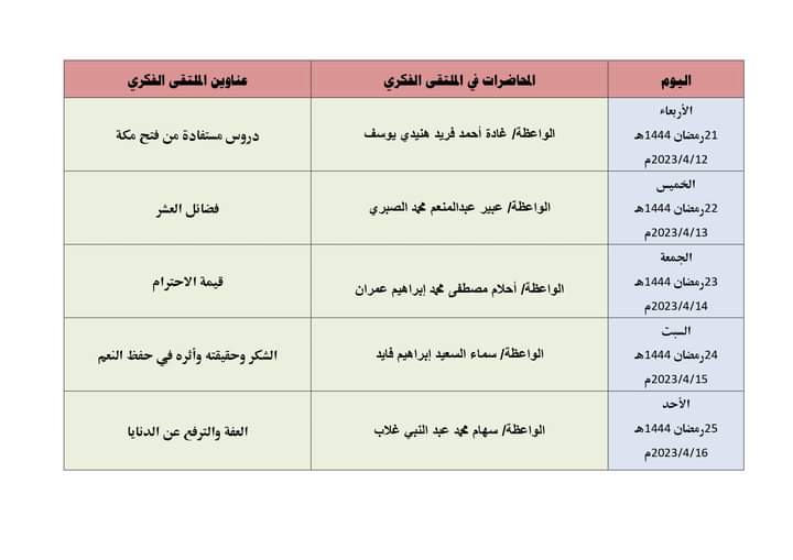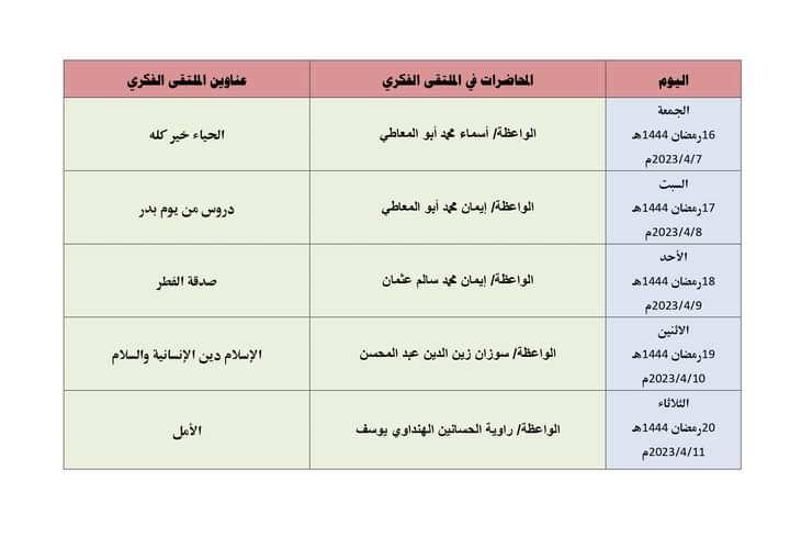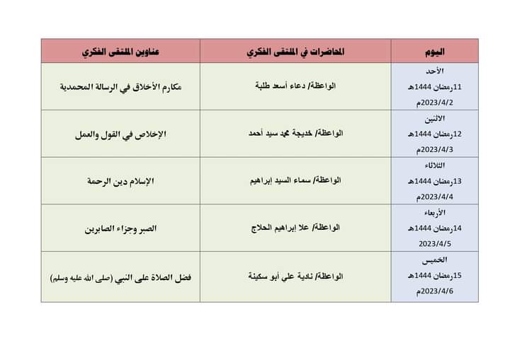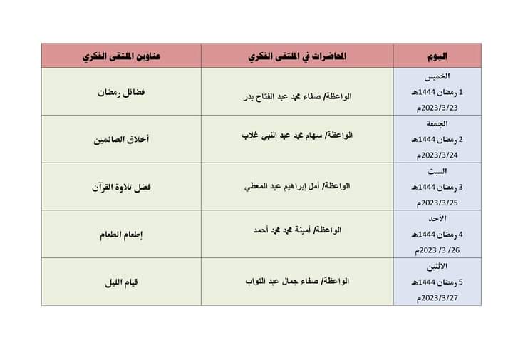 أعلنت وزارة الأوقاف لشهر رمضان المبارك واهتمامها بدور المرأة في المجتمع ونشر الفكر الوسطي المستنير، يسرنا أن نعلن عن انتهاء إعداد الملتقى الفكري الرمضاني للواعظات لعام 1444هـ /2023م.