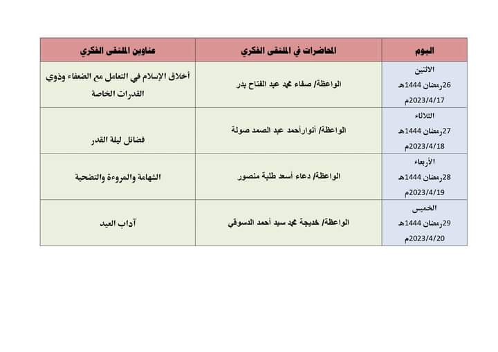 ويعقد يوميًّا عقب صلاة الظهر، بمسجد (سيدي أحمد البدوي بطنطا)، ويحاضر فيه نخبة من واعظات وزارة الأوقاف، وفق الجدول التالي: