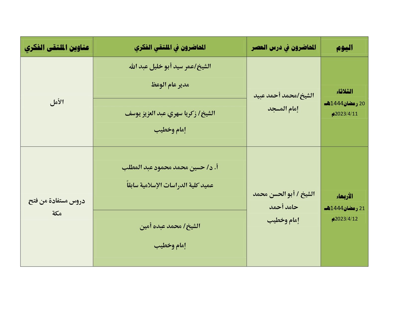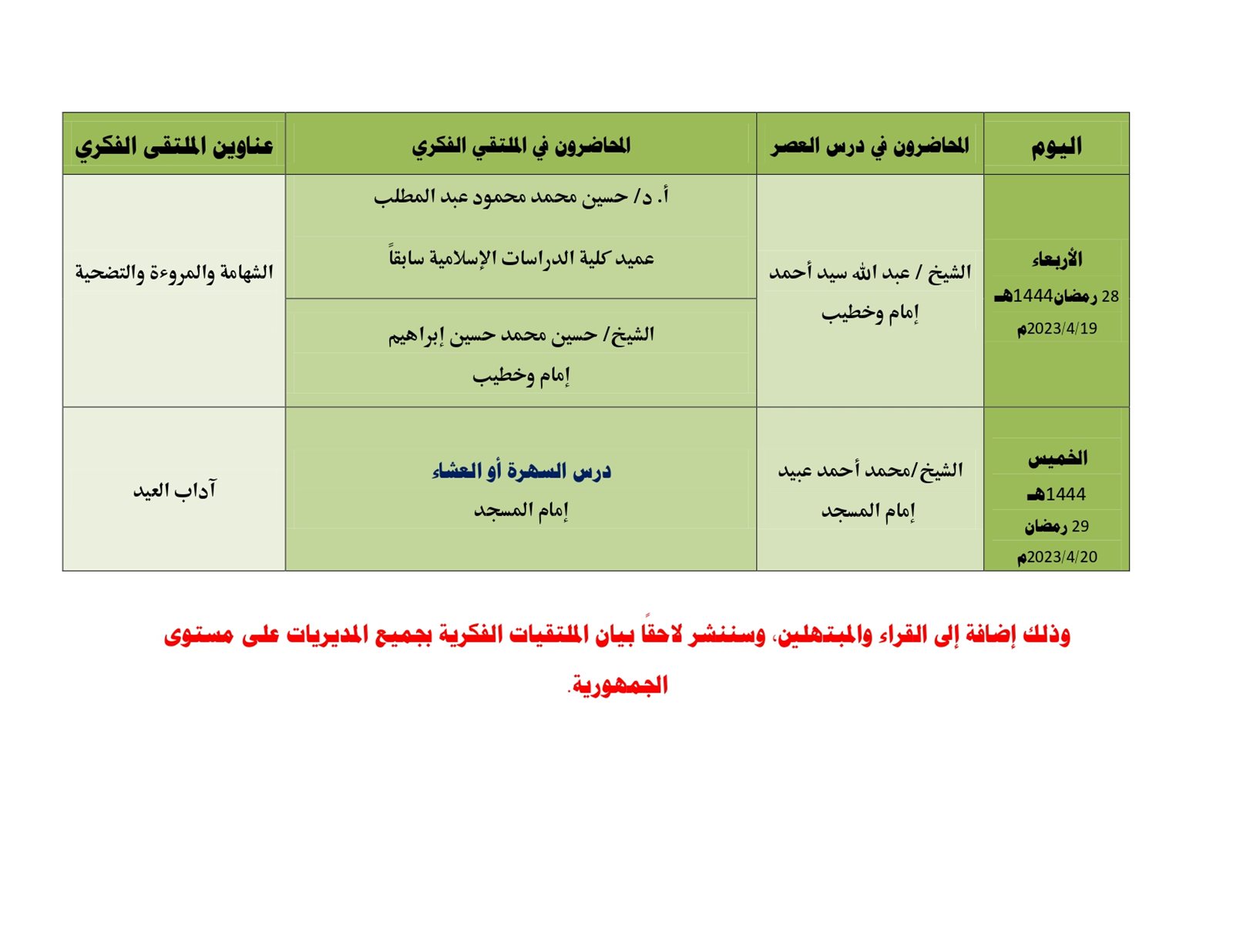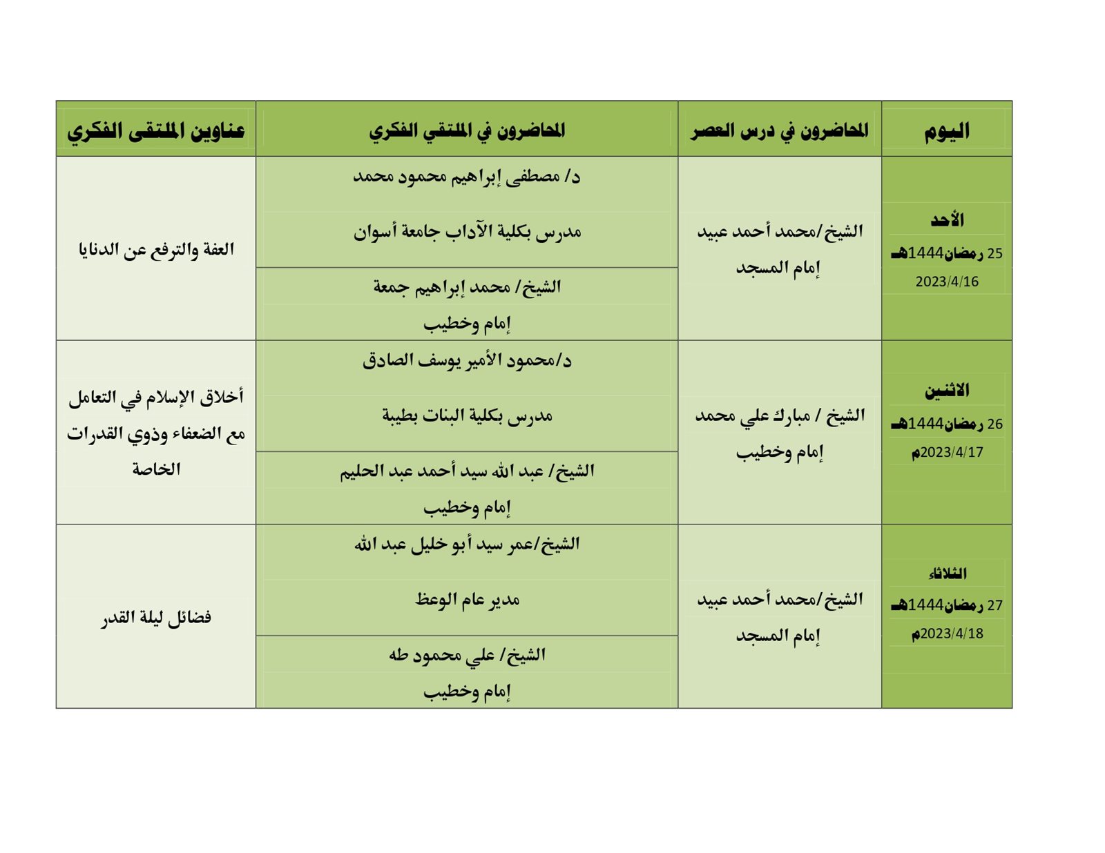 ويحاضر فيه نخبة من كبار العلماء بالأزهر الشريف ووزارة الأوقاف، وذلك فضلًا عن القراء والمبتهلين ومقدمي ملتقى الفكر من الإعلاميين وفق الجدول التالي:
