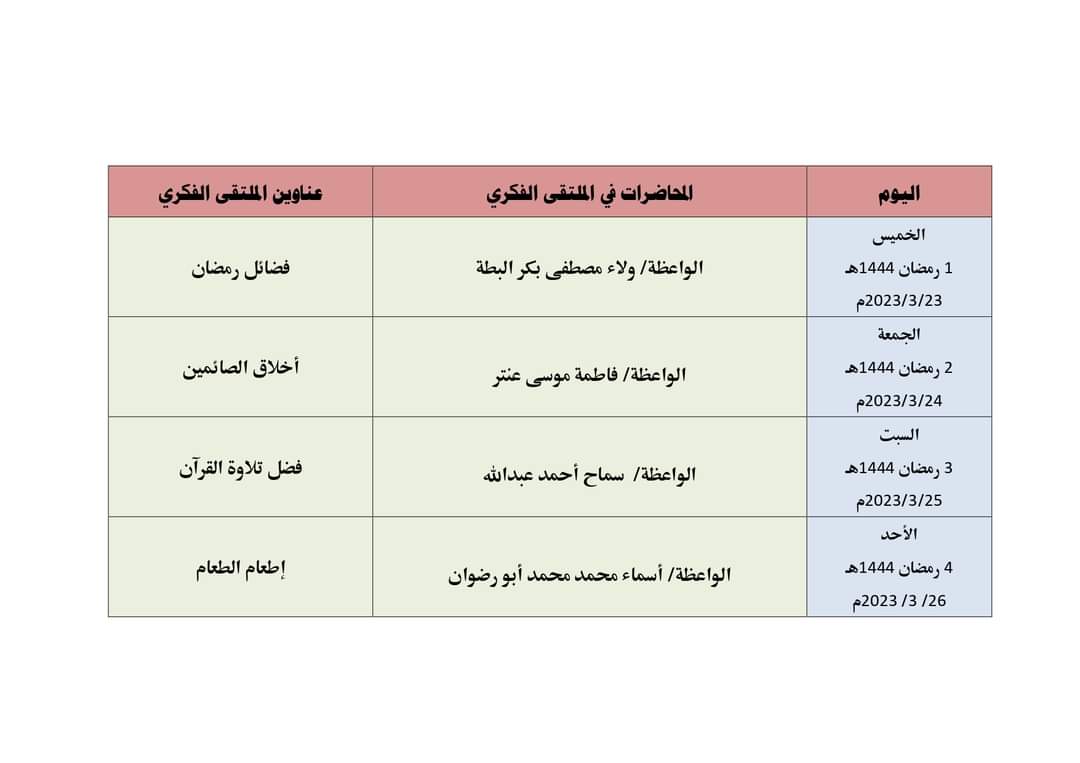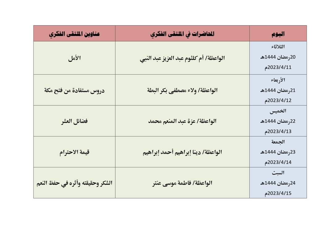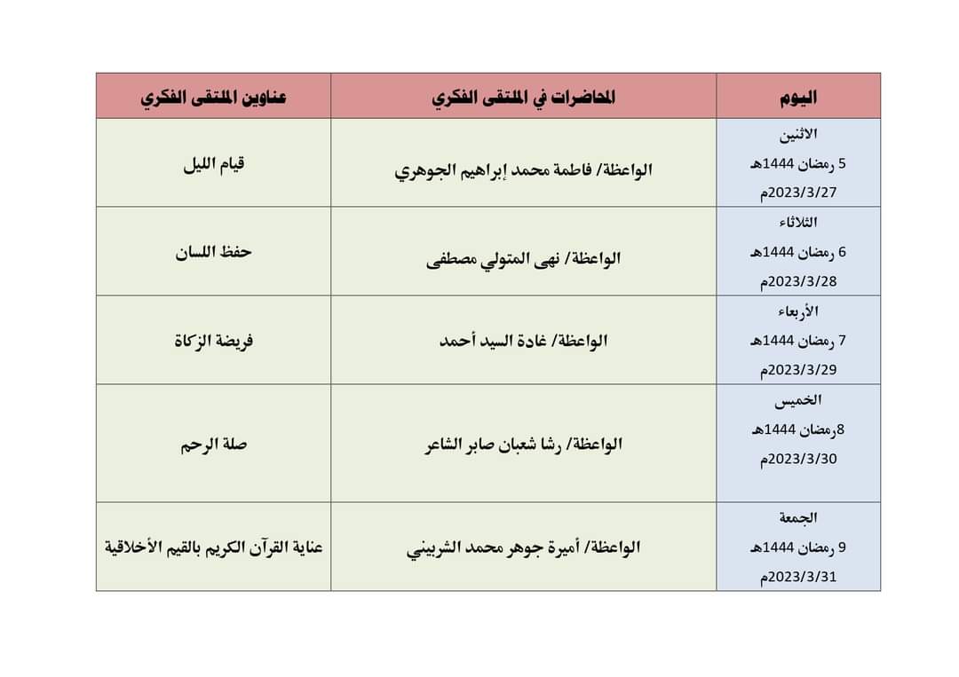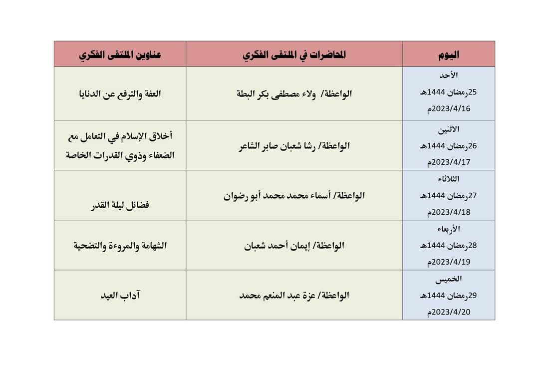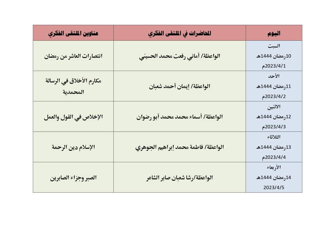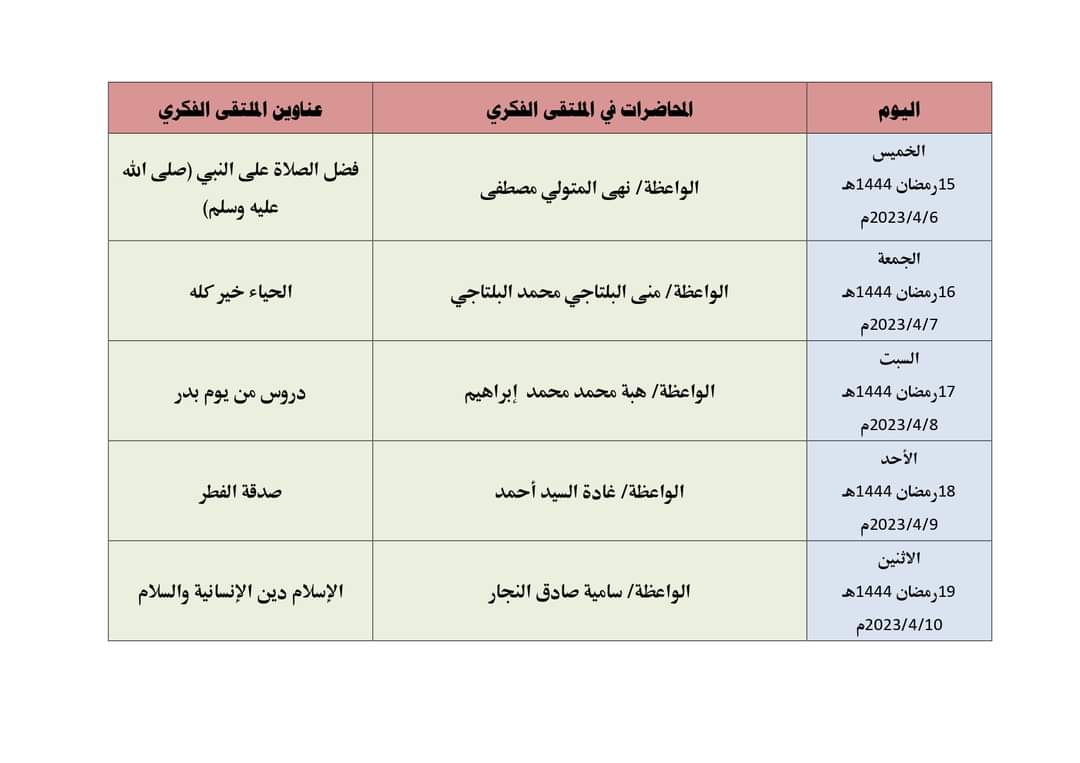 ويحاضر فيه نخبة من واعظات وزارة الأوقاف، وفق الجدول التالي: