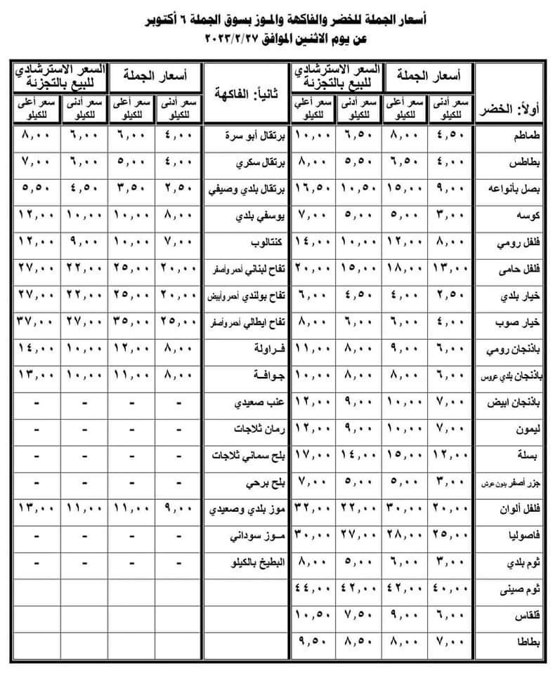 أسعار الخضر والفاكهة بسوق الجملة 6 أكتوبر