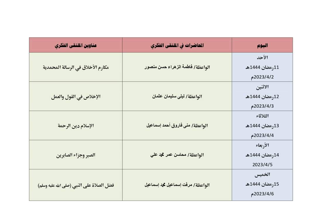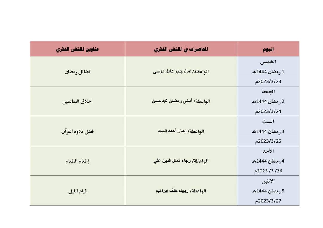 أعلنت وزارة الاوقاف المصرية عن إعداد الملتقى الفكري الرمضاني للواعظات لعام 1444هـ /2023م،ملتقى الفكر الإسلامي للواعظات بالشرقية والذي يعقد يوميًّا عقب صلاة الظهر بمسجد الفتح بمدينة الزقازيق، ويحاضر فيه نخبة من واعظات وزارة الأوقاف، وذلك في إطار استعدادات وزارة الأوقاف لشهر رمضان المبارك واهتمامها بدور المرأة في المجتمع ونشر الفكر الوسطي المستنير.