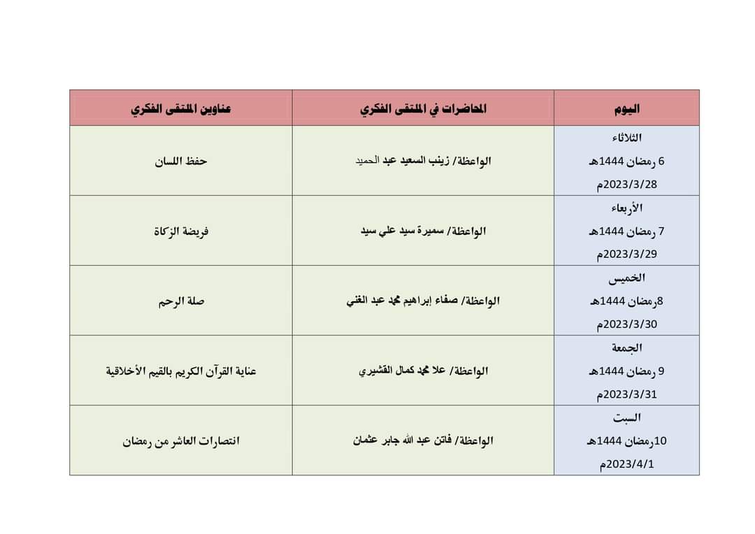 وحصلت "فيتو" على "جدول الملتقى المقرر عقده يوميًّا، بمسجد عمر بن عبد العزيز ببني سويف، بداية من أو أيام شهر رمضان، وحتى 29 رمضان، على النحو التالي: