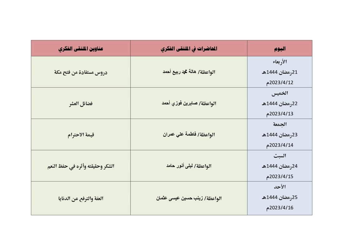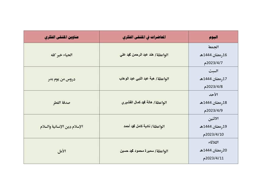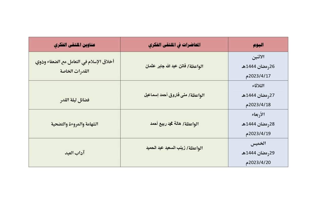 أعلنت وزارة الأوقاف لشهر رمضان المبارك واهتمامها بدور المرأة في المجتمع ونشر الفكر الوسطي المستنير، يسرنا أن نعلن عن انتهاء إعداد الملتقى الفكري الرمضاني للواعظات لعام 1444هـ /2023م.