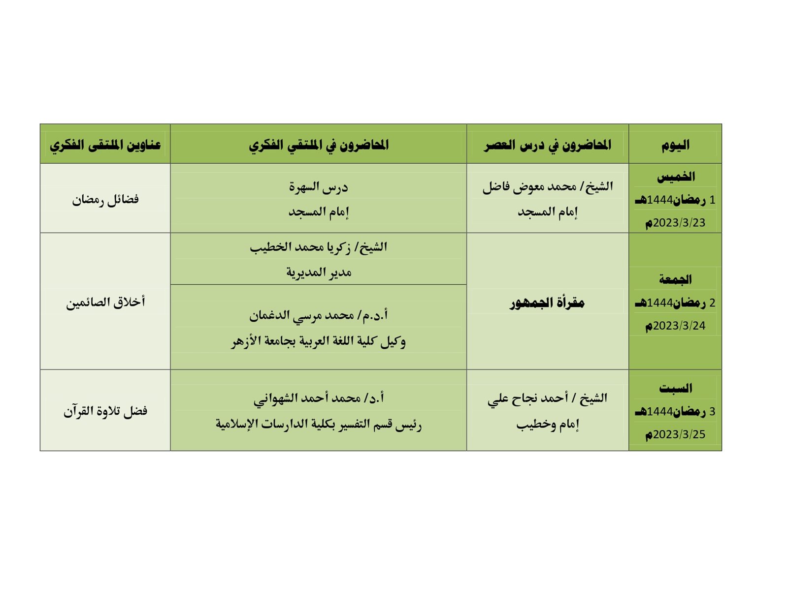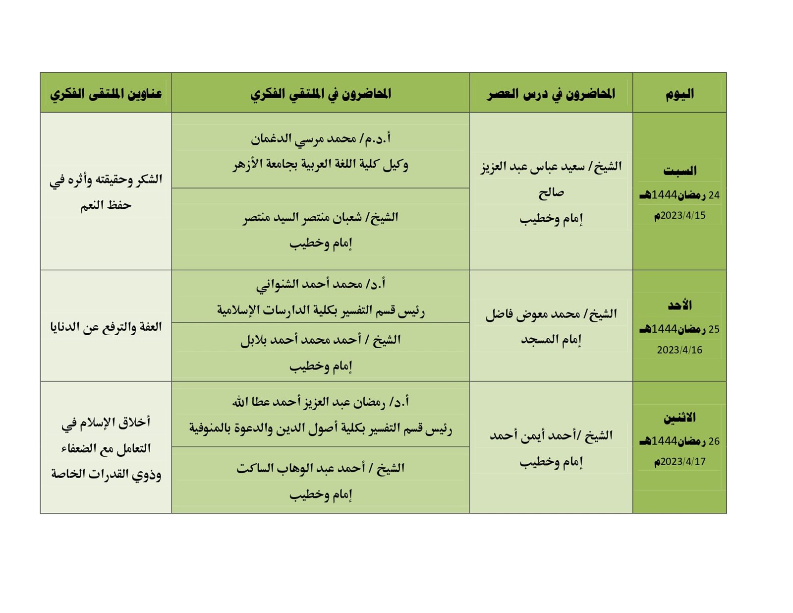 وصرح الشيخ السيد يوسف السيد غيط مدير مديرية جنوب سيناء بأن المديرية قد انتهت من الإعداد لملتقى الفكر الرمضاني عام 1444هــ - 2023م الذي يعقد يوميًّا عقب صلاة التراويح بمسجد (المنشية)، ويحاضر فيه نخبة من كبار العلماء بالأزهر الشريف ووزارة الأوقاف، وذلك فضلًا عن القراء والمبتهلين ومقدمي ملتقى الفكر من الإعلاميين وفق الجدول التالي: