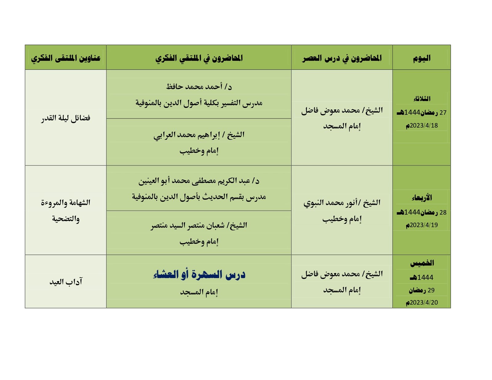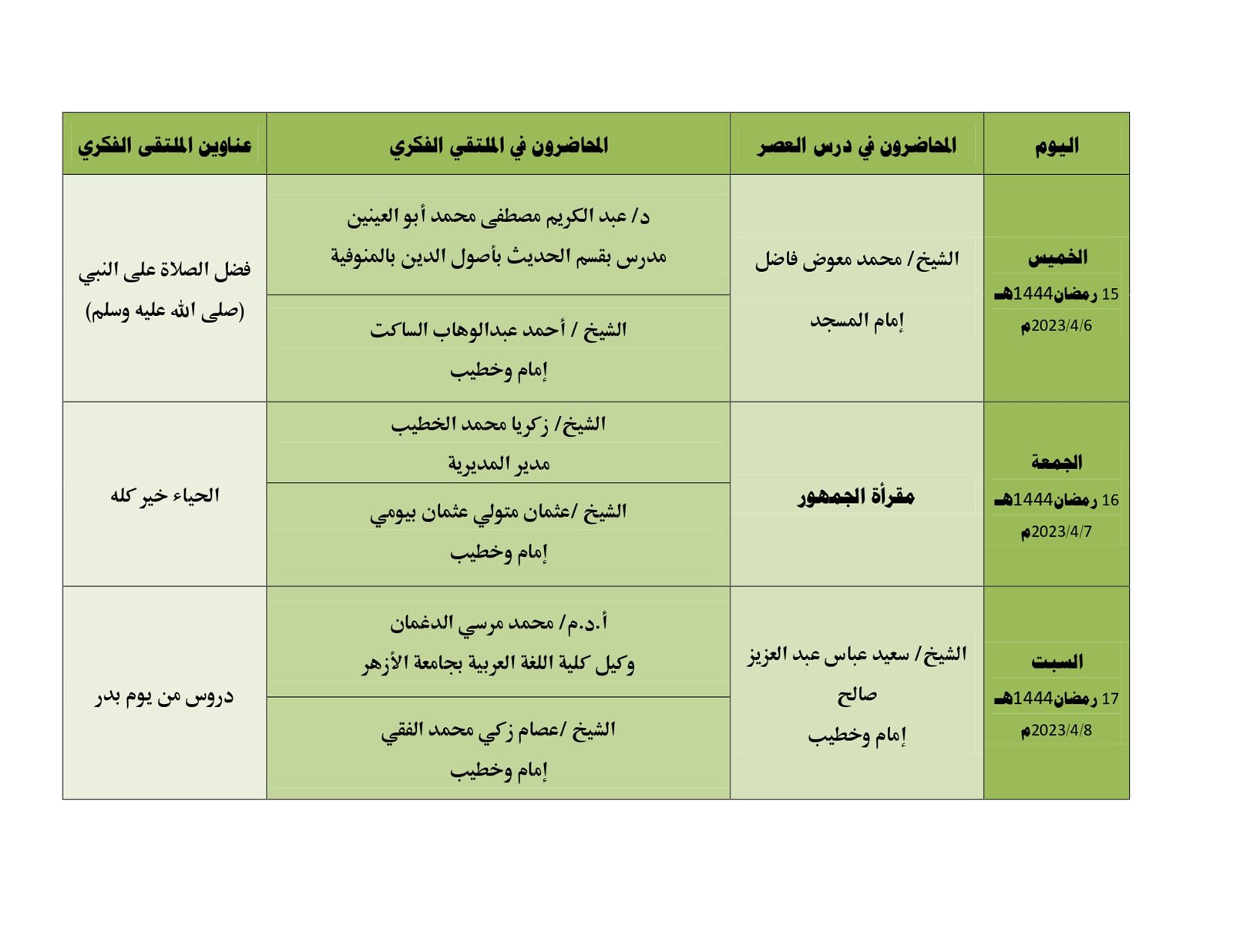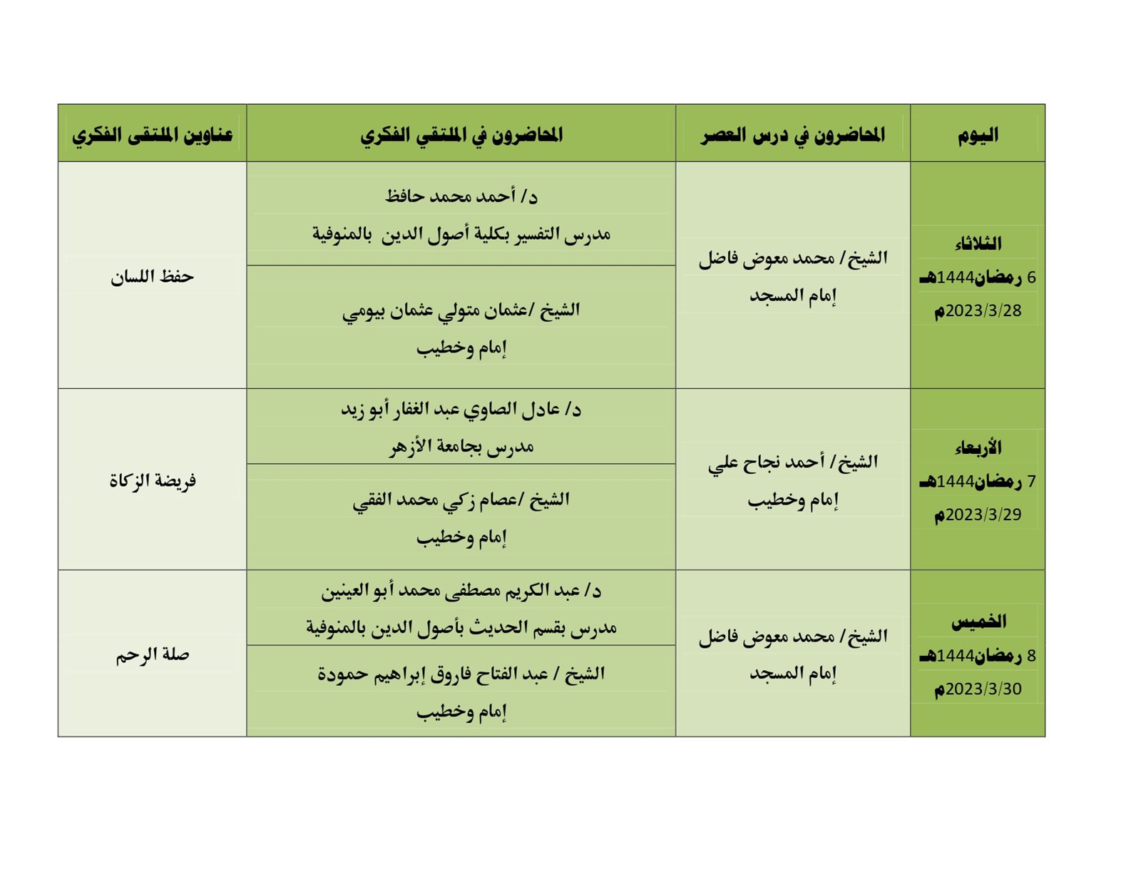 ويعقد يوميًّا عقب صلاة التراويح بمسجد الأنصار- شبين الكوم- المنوفية، وفق الجدول التالي: